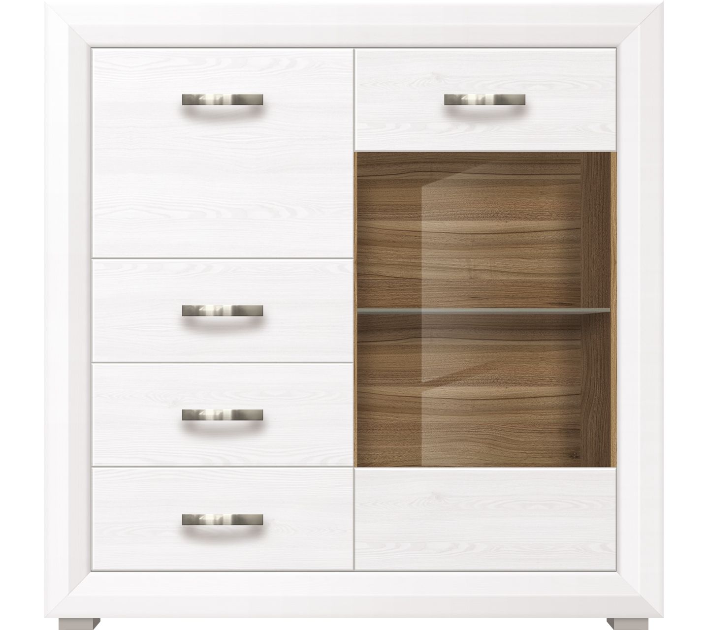Напольная витрина Malta – это небольшой шкаф высотой 108 см и шириной 106 см. Его конструкция включает одну распашную дверь со стеклянной вставкой и четыре вместительных ящика. Модель укомплектована металлическими ручками серебристого цвета и небольшими пластиковыми ножками. Фасады имеют гладкую, матовую поверхность.