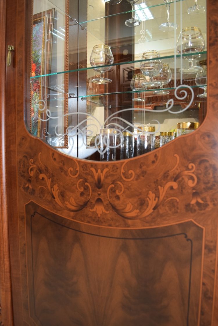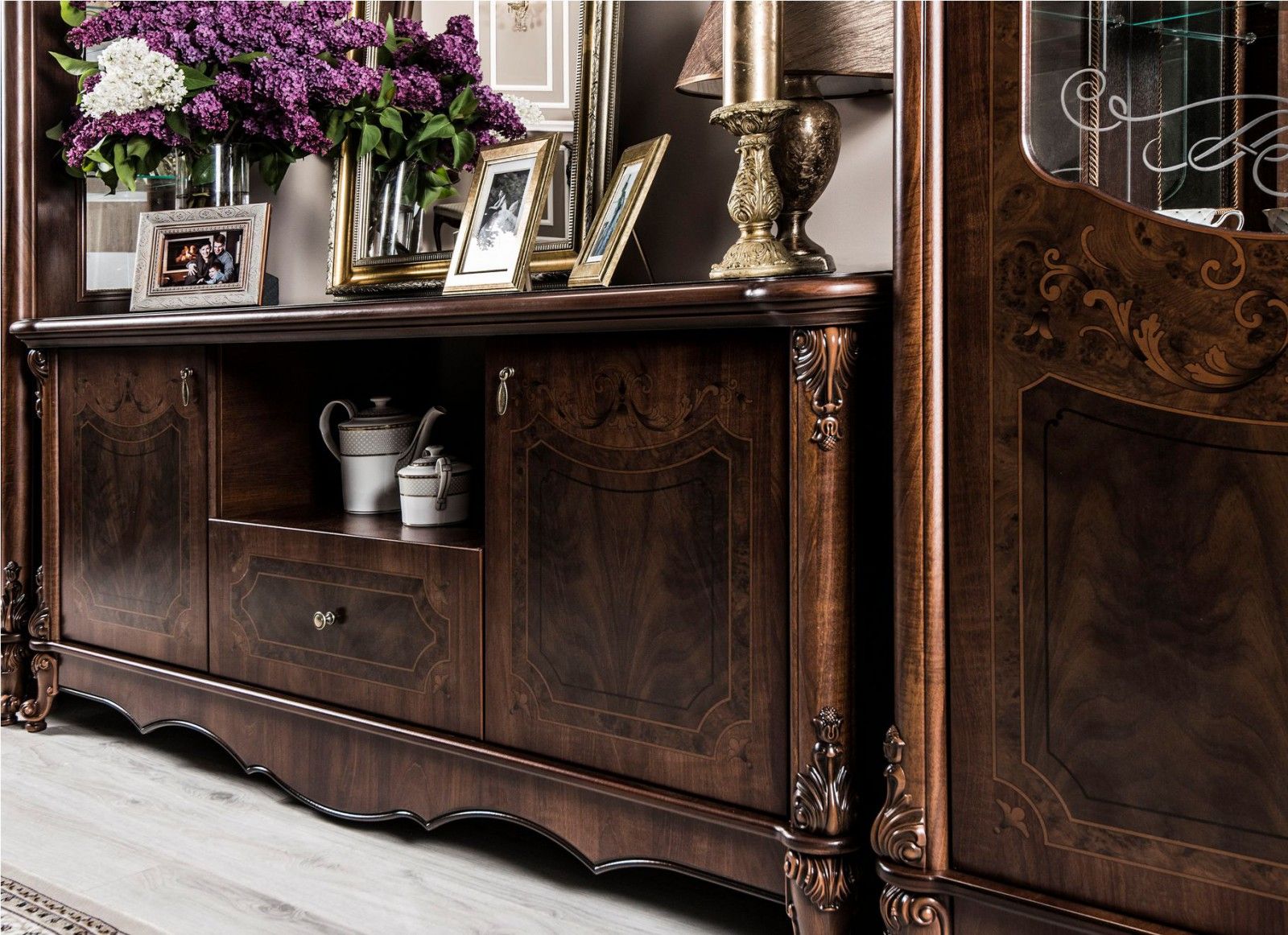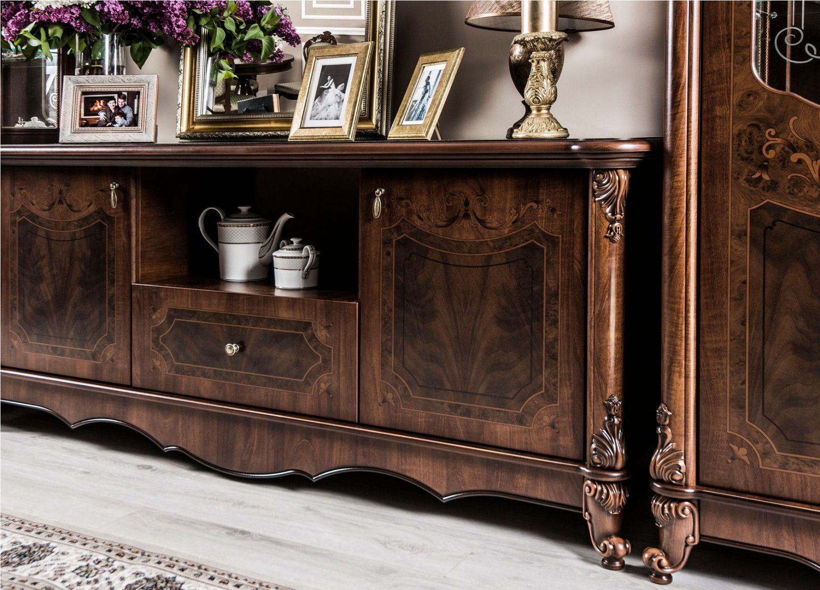 Декоративные элементы, фасады, накладки покрыты золотой, темной патиной и матовым лаком