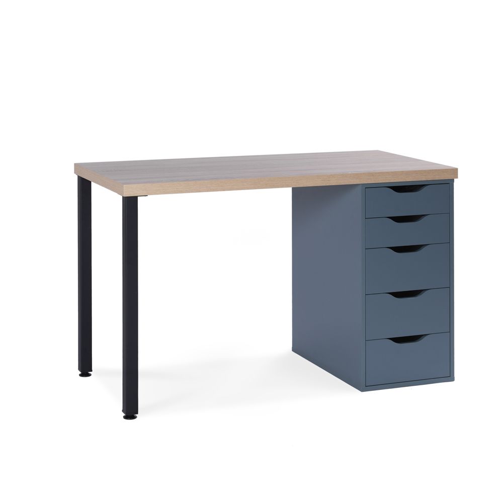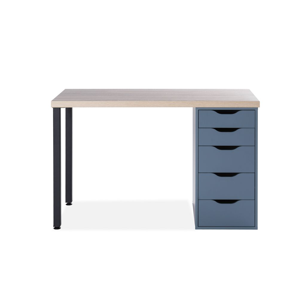 Стол письменный Ингар 1/5Т, 120x75x55, цвет Дуб беленый/серо-бирюзовый/черный. Стол комплектуется столешницей, двумя металлическими ножками и тумбой под столешницу с пятью выдвижными ящиками. Конструкция столешницы - тамбурат (рамка из ДСП и HDF с сотовым заполнением) - популярная современная технология, активно внедряемая крупнейшими производителями для изготовления мебели по скандинавским стандартам. Ножки - крашенный металл в черный цвет. Опоры ножек регулируемые. Конструкция тумб стола: ДСП, поверхность, декорированная бумага, окраска УФ материалами. Фасады ящиков без ручек, с вырезами для удобного выдвижения. Ящики переменной высоты позволяют использовать их для хранения разнообразных предметов.Преимущества: облегченная конструкция (тамбурат); высокая прочность, устойчивость; простая, быстрая сборка; эстетичный внешний вид. Гарантийный срок для жилых и общественных помещений 24 месяца.