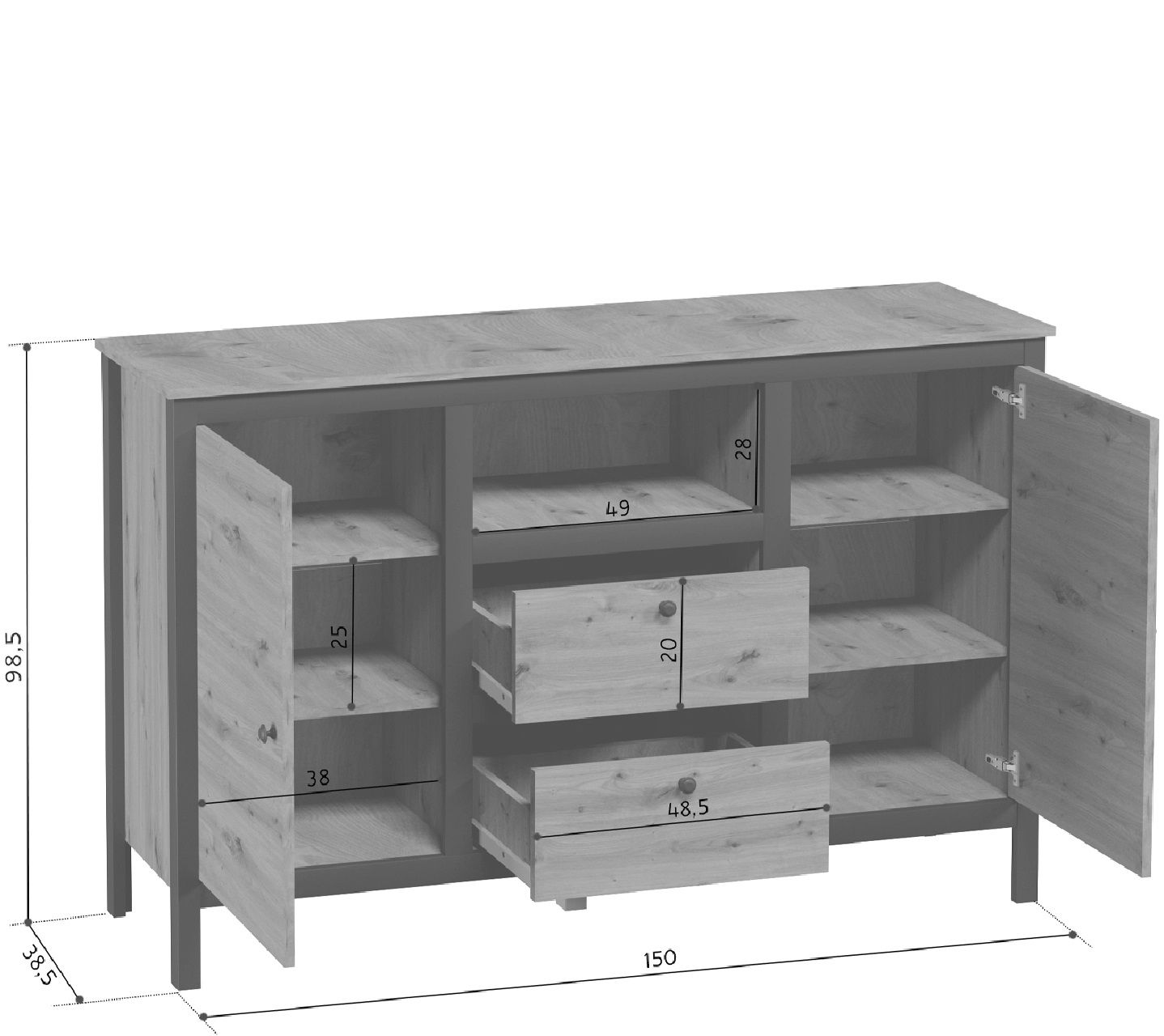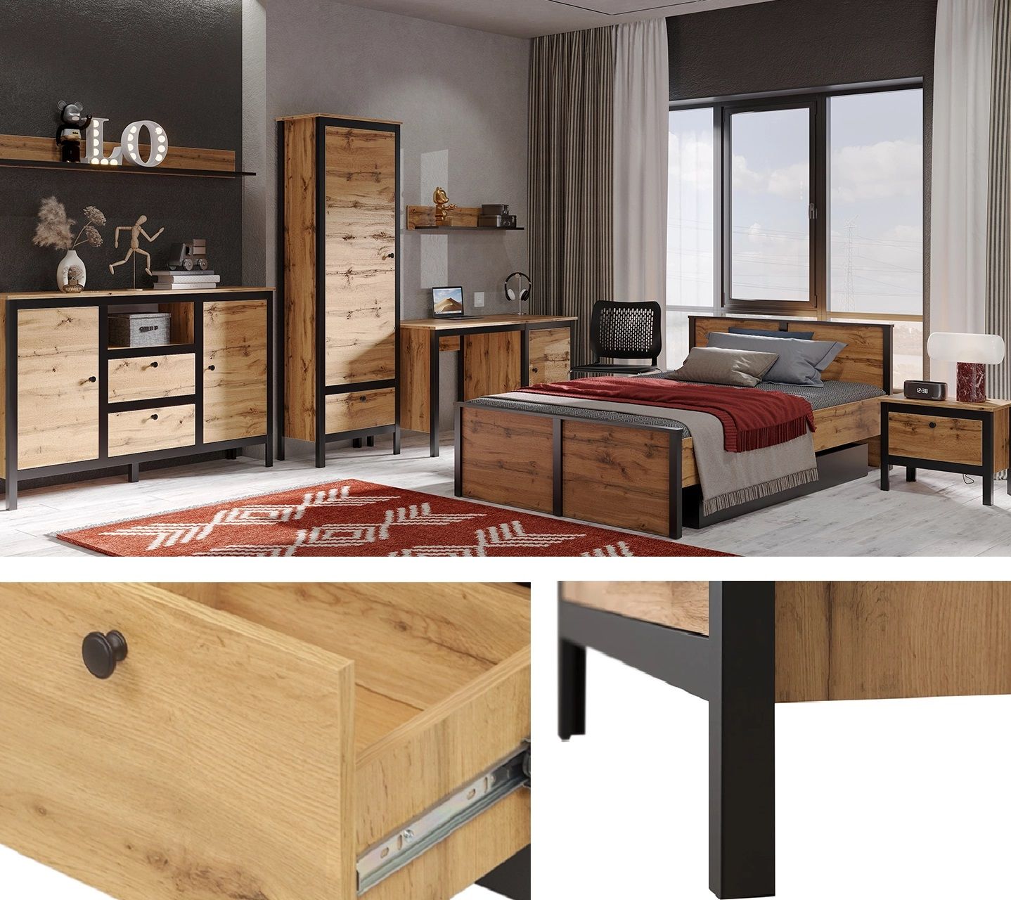 Широкая тумба Loft объединяет функцию хранения и декора. Она состоит их двух распашных дверей, двух ящиков и одного открытого отделения. Корпус изготовлен из древесно-стружечной плиты класса Е1 и МДФ. Поверхность тумбочки оклеена ламинированной пленкой под дуб вотан, ножки представлены в черном цвете. По всему периметру проходит темная окантовка. Такое контрастное сочетание – характерная черта коллекции и интерьерного стиля лофт.
