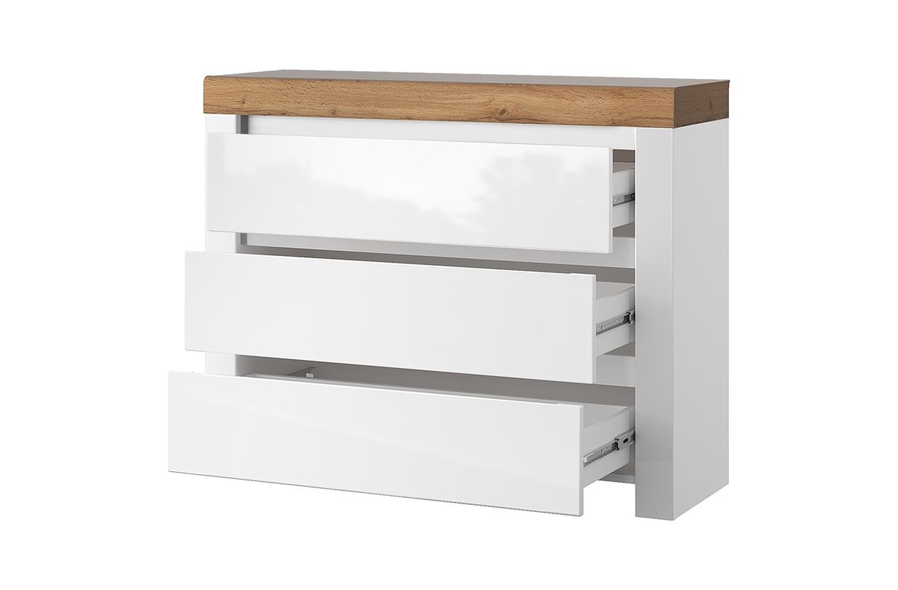Универсальный комод Taurus 3S – это модное решение для стиля минимализм, хай-тек и других современных стилей. Модель привлекает гармоничным сочетанием белого глянца и коричневой рабочей поверхностью под дуб вотан. Она представлена в предельно лаконичной отделке. Гладкие фасады такой мебели не мешают перемещаться по комнате. Отсутствие выступающих элементов гарантирует безопасное использование для взрослых и детей.