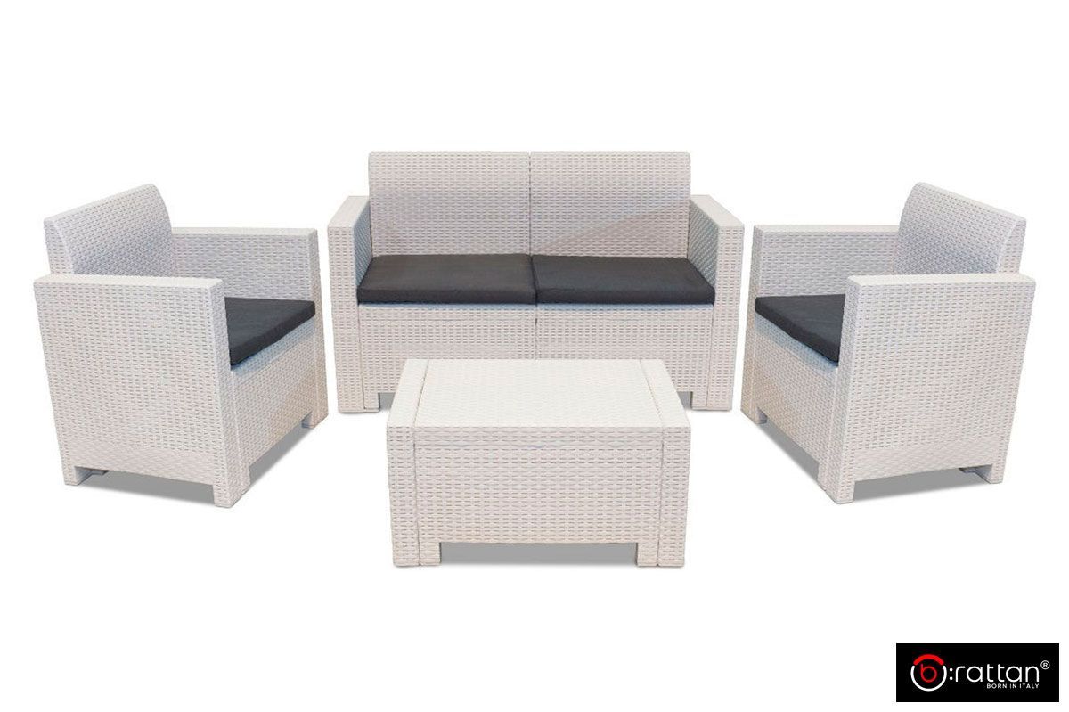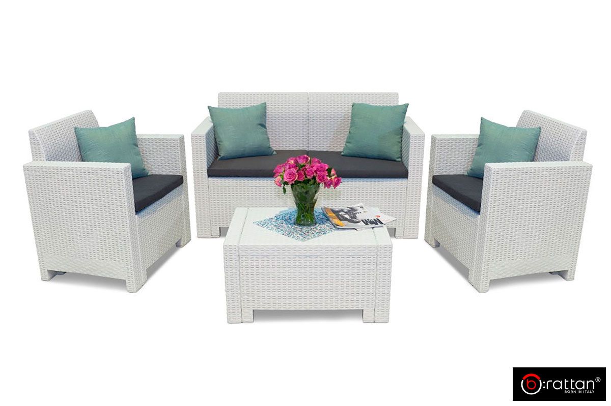 Стильная итальянская мебель для кафе, ресторанов и отелей Nebraska Set 2 от итальянского производителя B:Rattan рассчитан на 4 персоны и включает 4 предмета: 2х-местный диван, 2 кресла и кофейный столик. Пластиковый комплект порадует любителей плетеной мебели своей фактурой в стиле ротанг и прочностью: максимальная нагрузка на кресло и диван — до 160 кг.