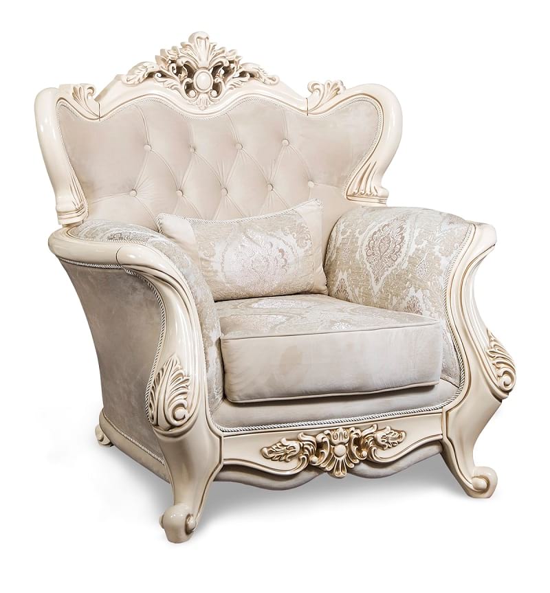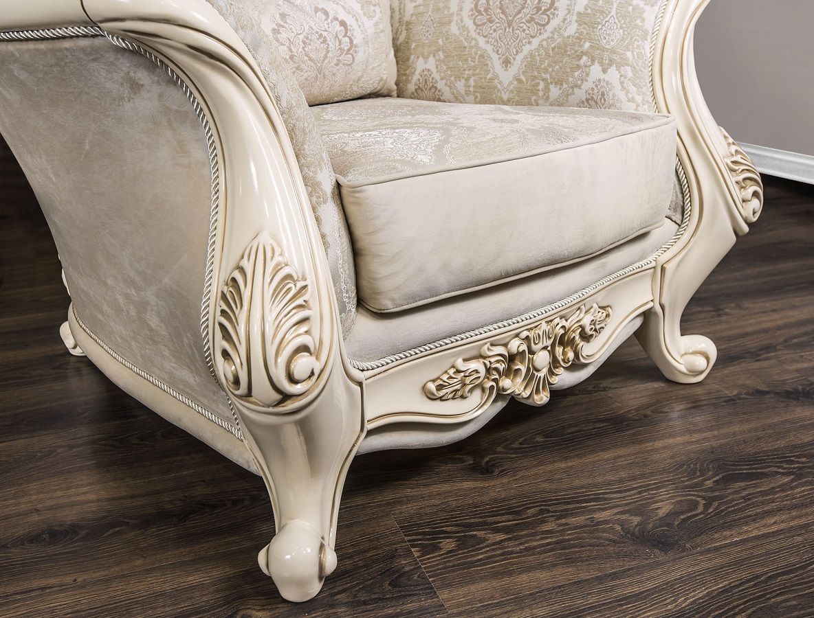Изысканное кресло «Джаконда» размером 115х118х95 см (ш/г/в) имеет сбалансированную глубину и подходит людям с массой тела до 110 кг. Эта модель с фигурными ножками изготовлена в России на мебельном предприятии «Эра» из соснового бруса, металлических элементов и пенополиуретана. Она представлена в цвете крем глянец, который делает окружающее пространство светлее и просторнее.