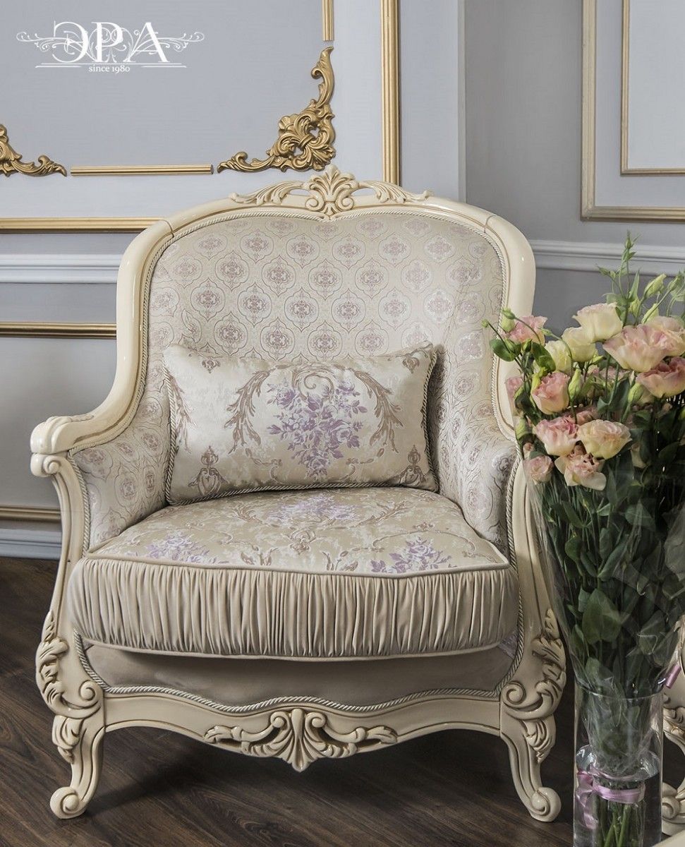 Кресло «Мона Лиза» в цвете крем изготовлена в России на предприятии «Эра». При производстве его каркаса использован сосновый брус. Другие составляющие изготовлены из фанеры и ППУ. В качестве декоративного покрытия применяется итальянский лак на водной основе. Такая мебель приобретает дорогой вид за счет обивки из жаккарда и накладных узоров с эффектом золочения. Особенно роскошно смотрятся резные ножки и драпировка и каретная стяжка по внешней стороне изделия.