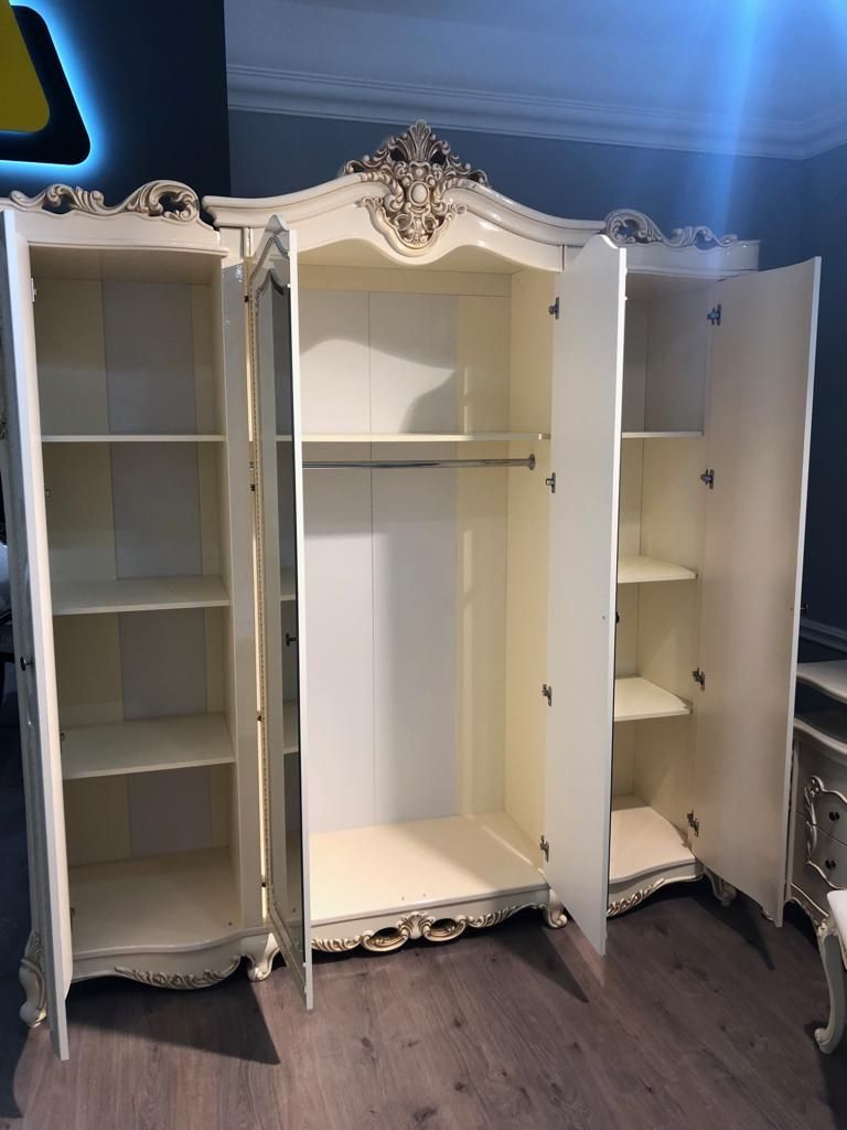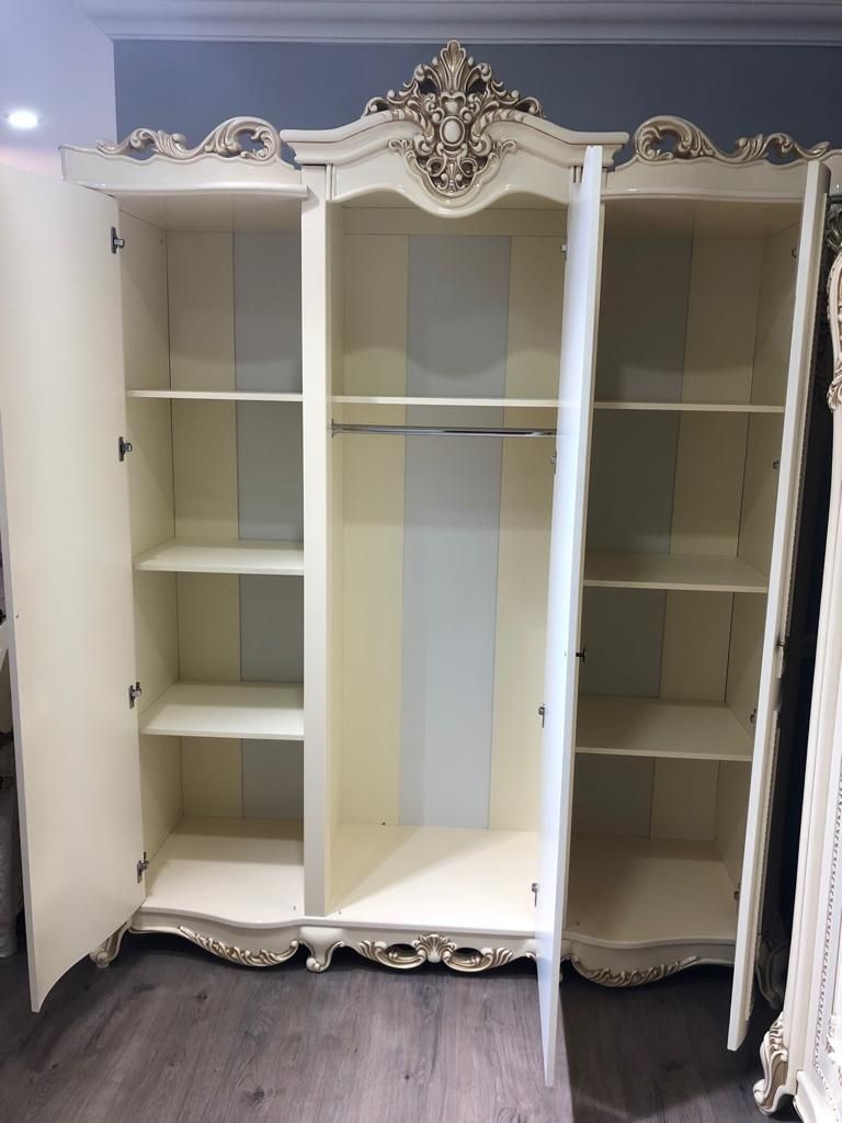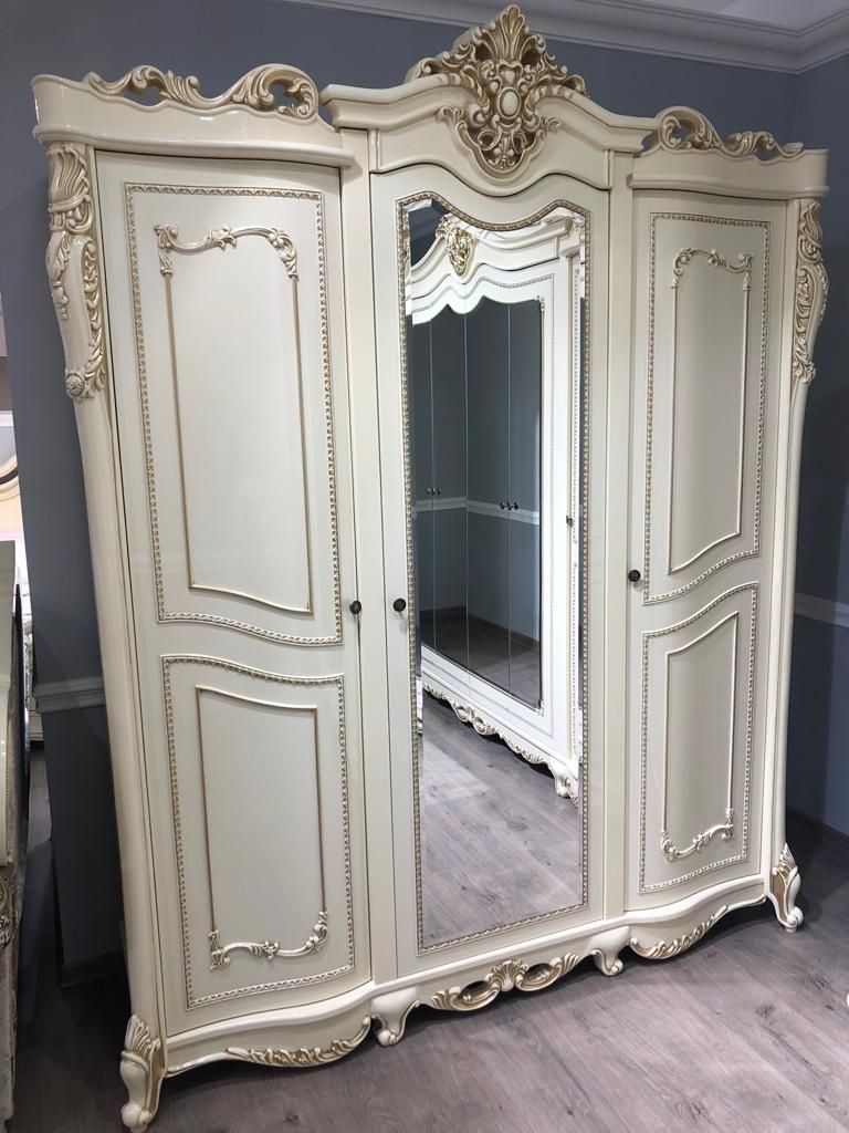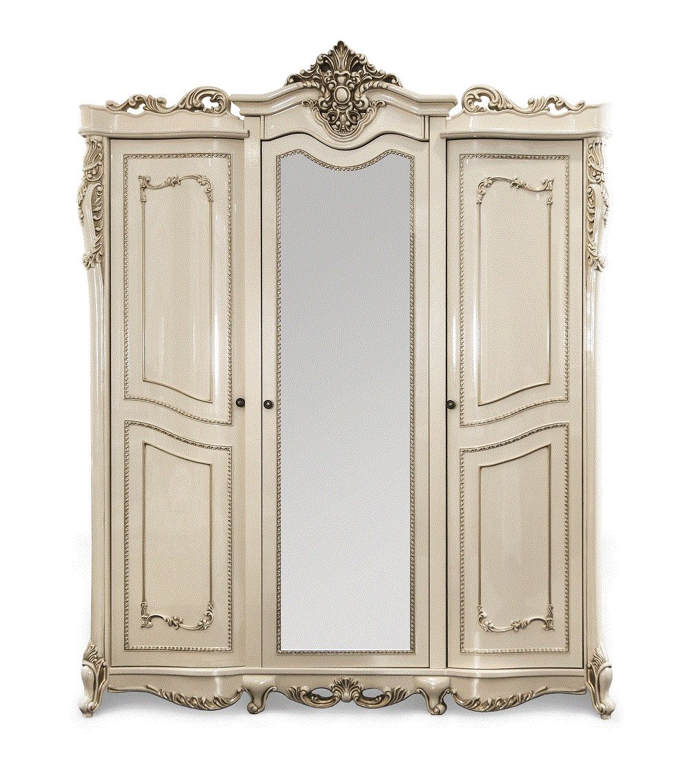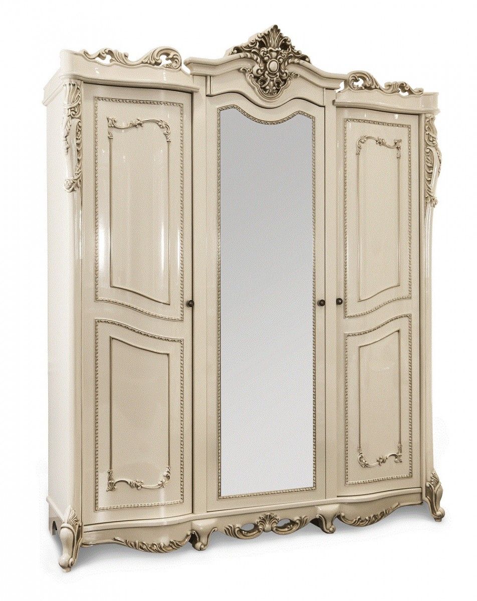 В отделке трехдверного шкафа «Джоконда» преобладают характерные черты дворцового стиля: сложный декор в виде золоченых орнаментов, изогнутых линий и элементов резьбы. Такая мебель подчеркивает статус и высокое положение в обществе. В ней идеально все: цвет, пропорции и наполнение. Кремовый оттенок придает этой мебели дорогой вид, избыточные узоры и фигурные ножки делают ее еще более привлекательной и яркой.