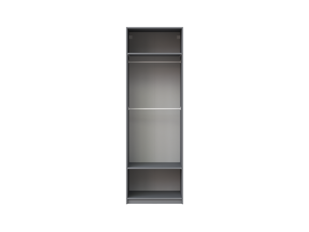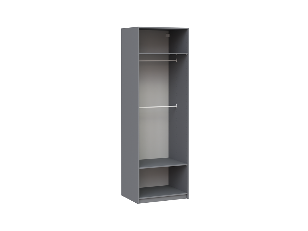 Стеллаж МАКС 75х58х233, цвет Серый Имеется возможность установки полок на желаемом уровне, имеется возможность установки штанги на желаемом уровне Толщины деталей: ДСП 18 мм Фурнитура: две штанги овальные металлические, полкодержатель пластмассовый с фиксатором