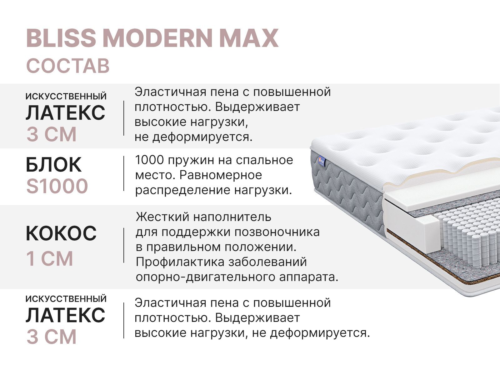 Классический ортопедический Димакс Bliss Modern max можно назвать стандартом золотой середины. Это очень комфортная модель с универсальными значениями жёсткости, которая подойдёт для абсолютного большинства людей, независимо от их любимой позы сна.