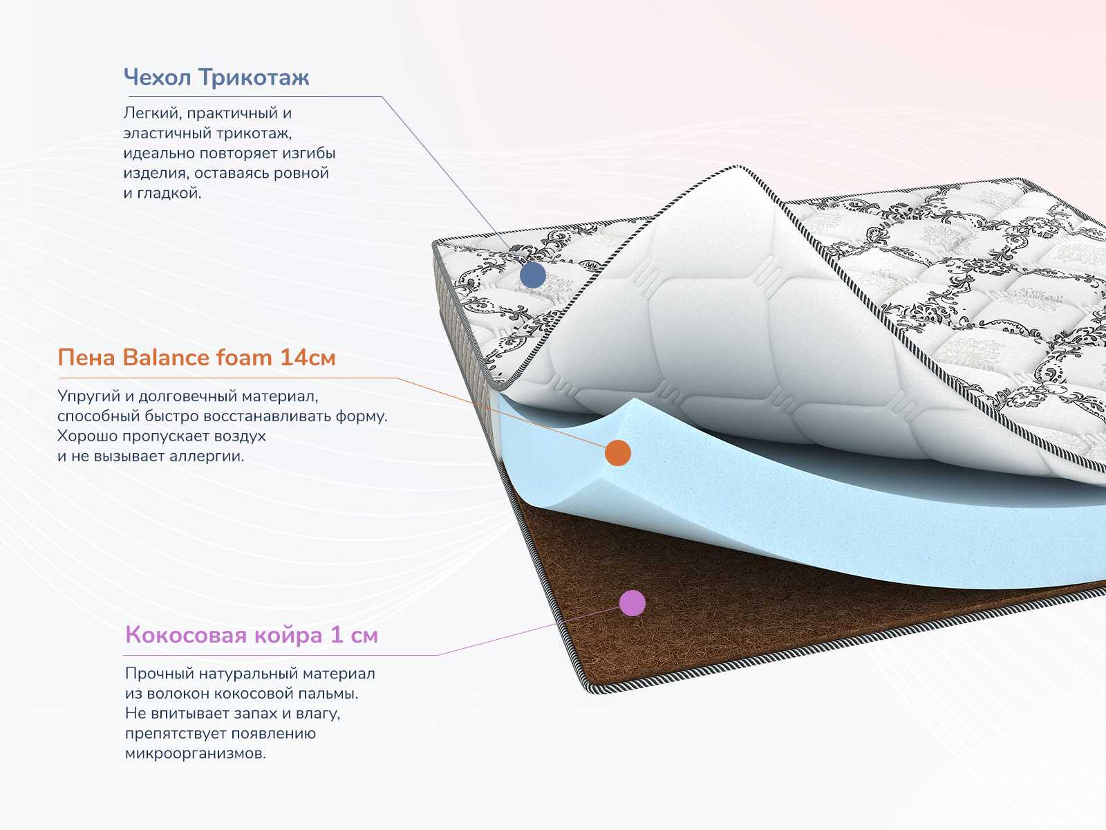 Чехол без молнии выполнен из трикотажной ткани (100% полиэстер, 230 гр./м2, простегана на 200гр. холлкона+0,8 ППУ). Изысканный узор в сочетании с объемной формой стежки и увеличенного количества наполнителя в чехле, придают матрасу неповторимый богатый вид и безупречно комфортные характеристики. Стильный бурлет выполнен из мебельной рогожки и простеган на 0,8 ППУ модным ромбовидным рисунком.Высота матраса - 16 см.