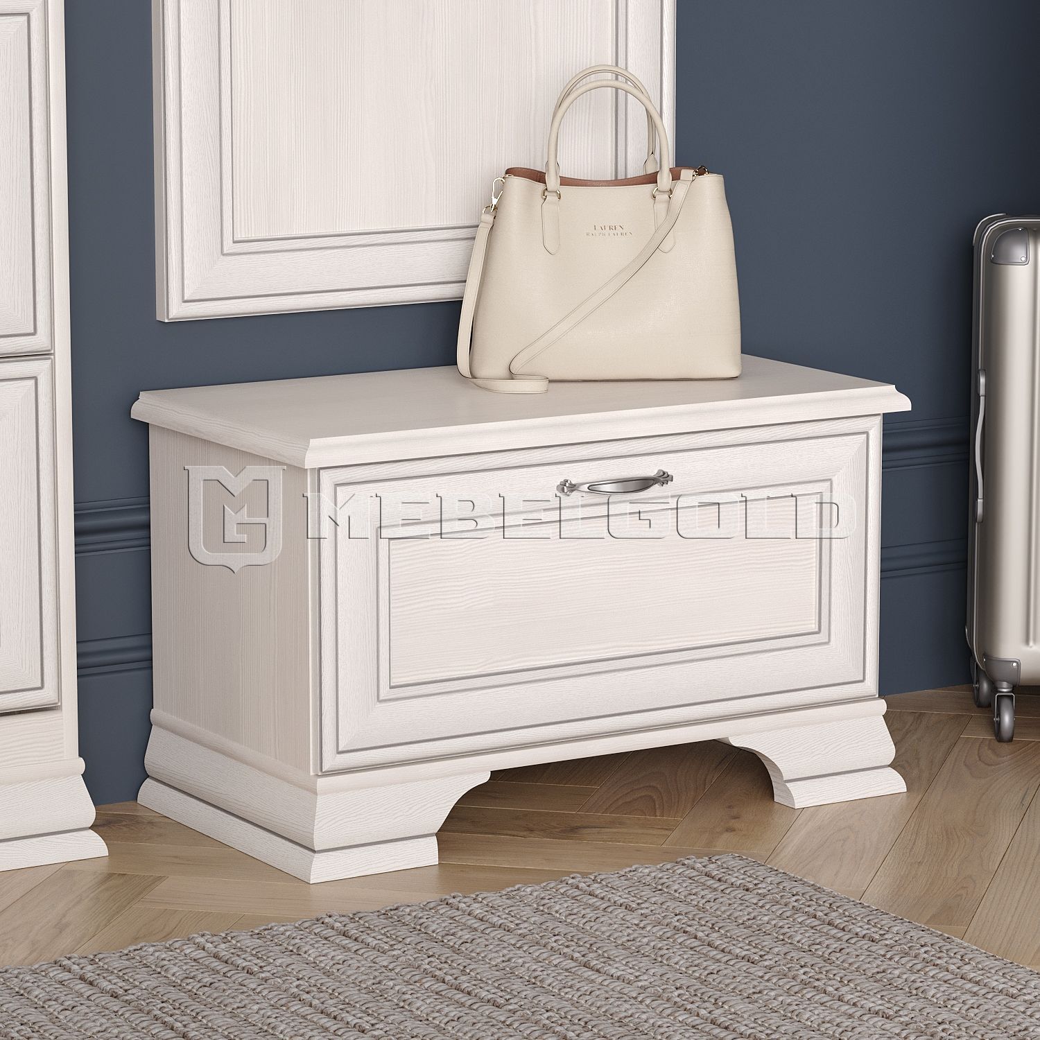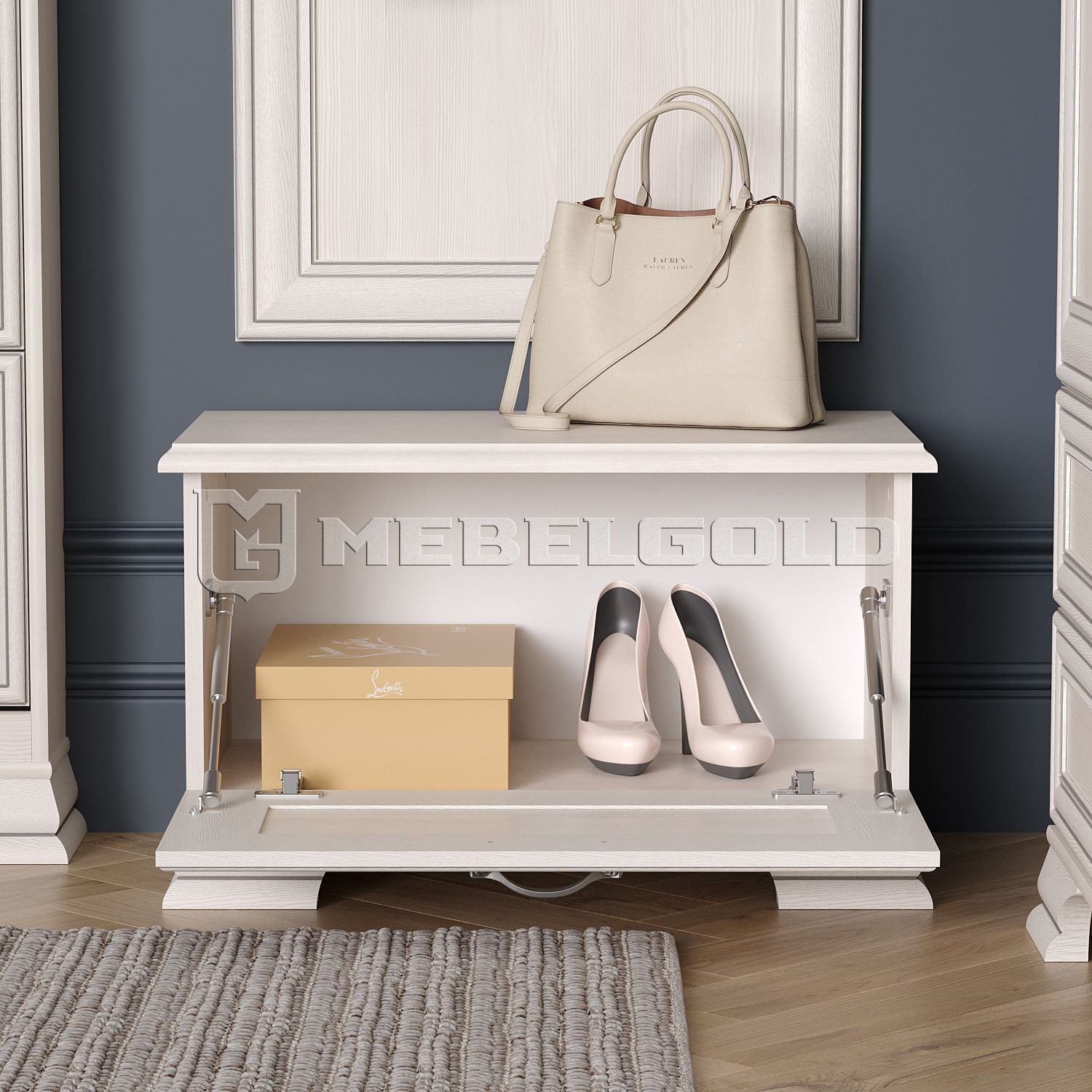 Тумба для обуви 1D Tiffany изготовлена на белорусском предприятии Anrex с использованием прочных и безопасных материалов, ЛДСП и МДФ. Фасады обувницы украшены легкими и тонкими филенками, по периметру проходит декоративная патинированная планка. Вместе с металлическими ручками-скобами под хром они создают гармоничный дуэт и идеально вписываются в прихожие классического стиля.