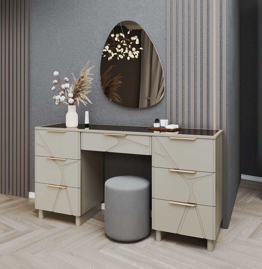 Туалетный стол "Лейла" придает интерьеру особый современный шарм. Просторная столешница и удобные выдвижные ящики, оснащенные доводчиками, обеспечивают максимальную функциональность и комфорт в вашей спальне такой столик можно использовать как косметический в паре с зеркалом, так и как рабочий стол для студента или школьника. Мягкий стильный пуф является дополнением к туалетному столу