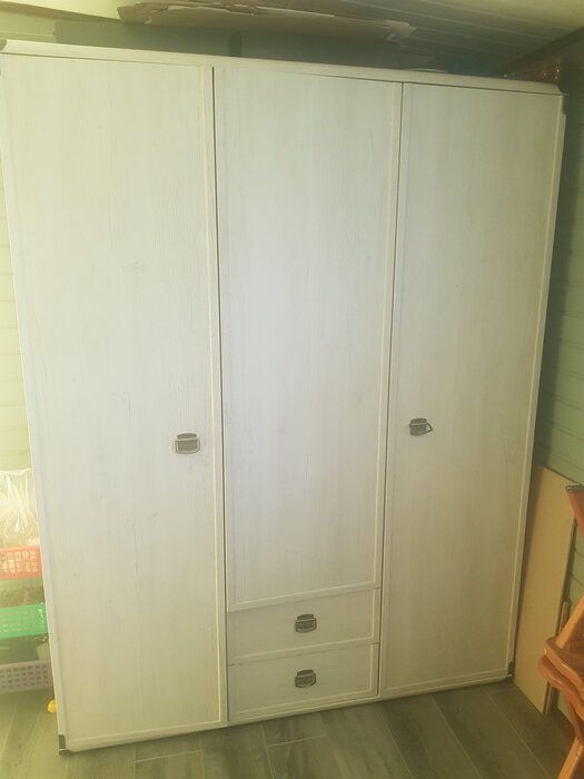Распашной шкаф «Индиана» имеет высоту 195 см и ширину 150 см. При глубине 57 см он уместит одежду на плечиках и позволит хранить ее в расправленном виде. Эта модель изготовлена в заводских условиях из недорогого, но прочного материала ЛДСП. По поверхности фасадов проходит планка из МДФ. Оригинальные ручки-подковы и металлические уголки придают ей стильный вид и позволяют с уверенностью использовать в классических и кантри интерьерах.