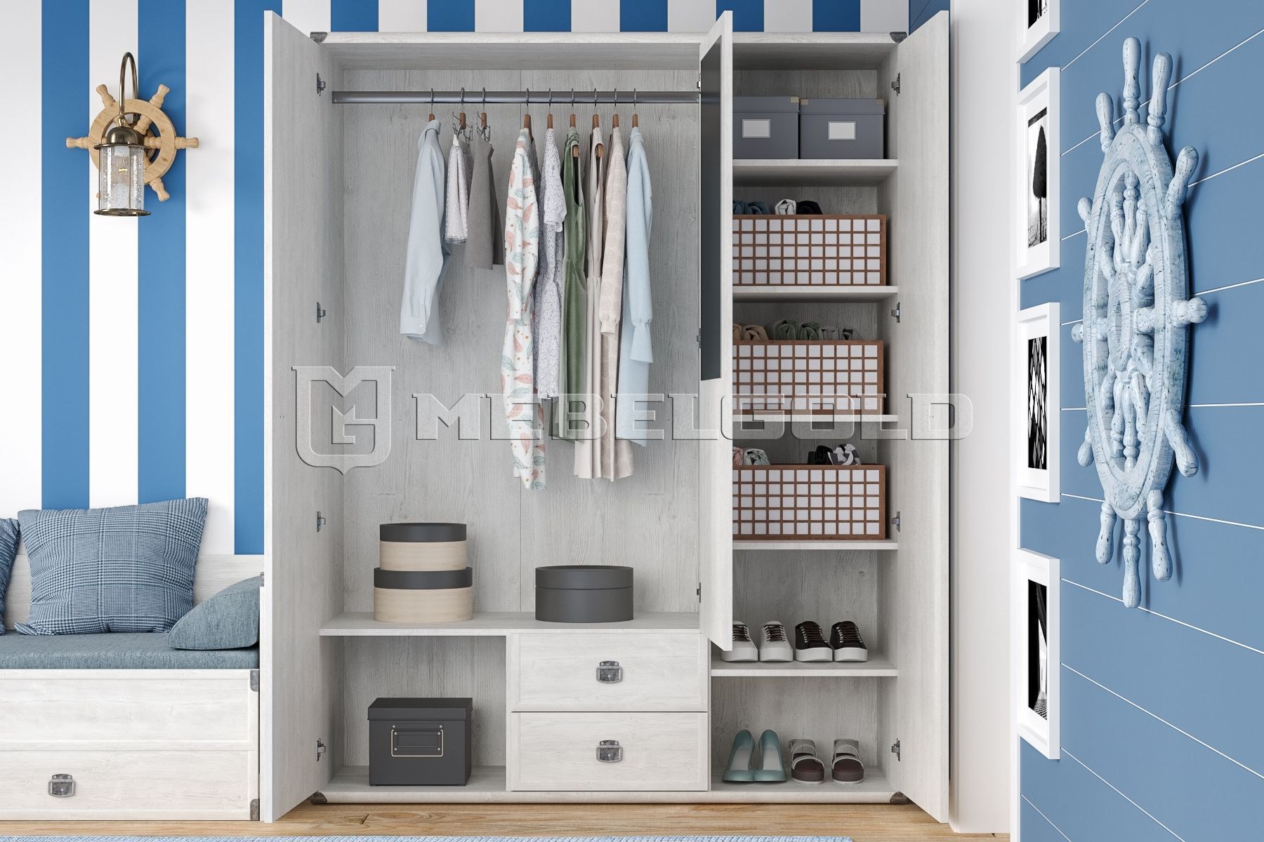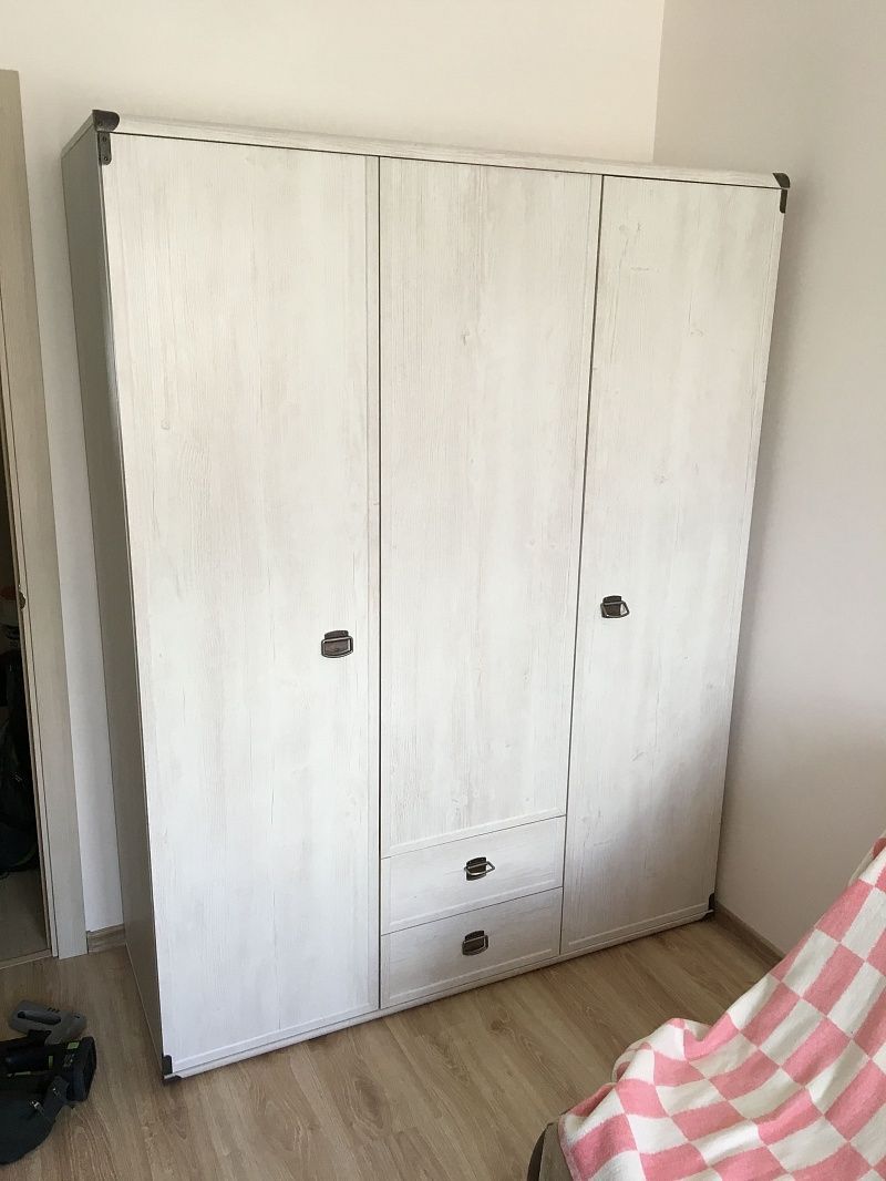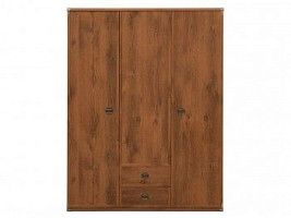 Трехстворчатый шкаф белорусского производителя Black Red White – самая вместительная модель коллекции Indiana. В его правой части располагается 5 полок. Слева находится платяное отделение с металлической штангой. Внизу добавлено два дополнительных ящика для хранения мелких вещей и обуви.