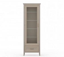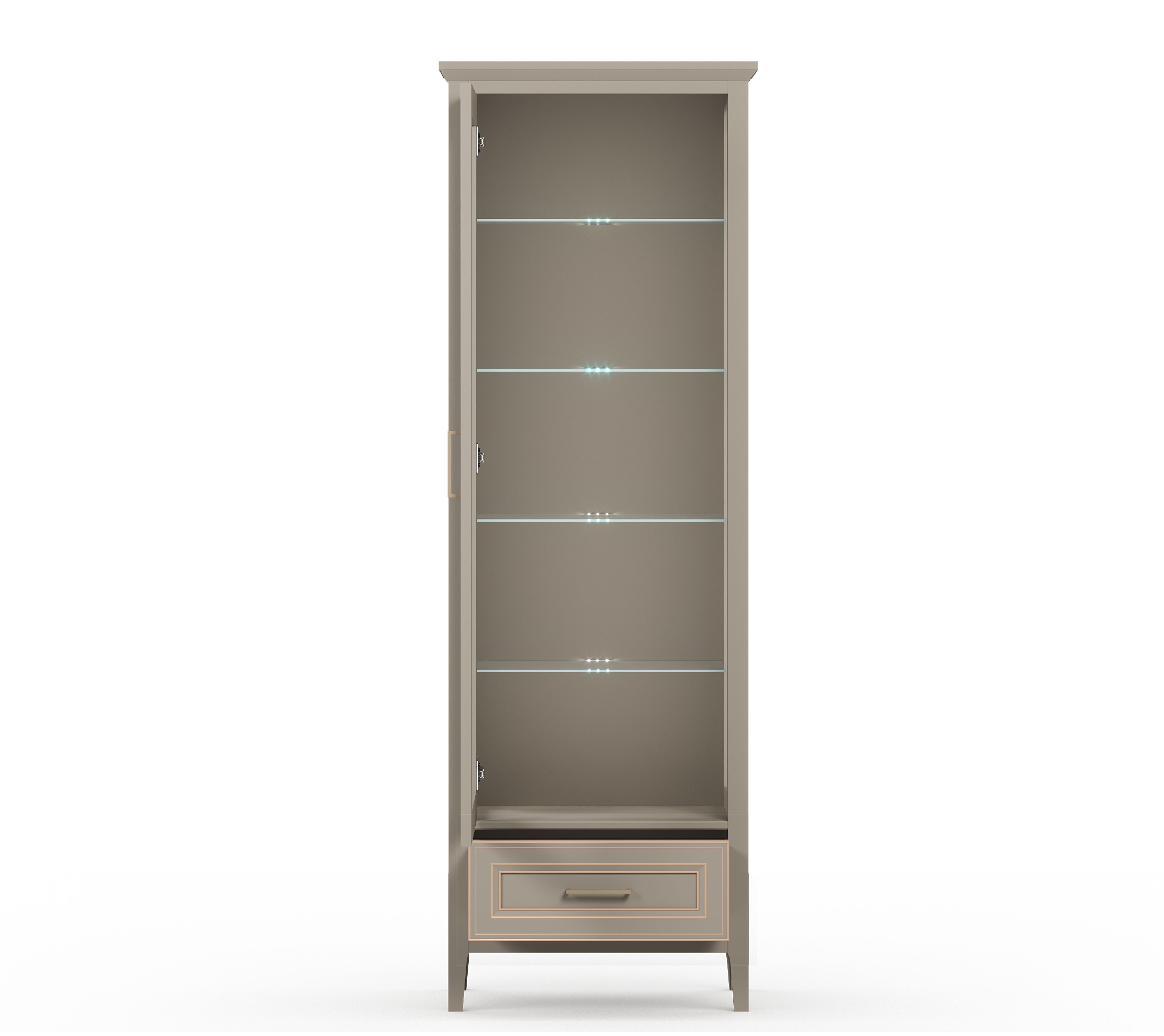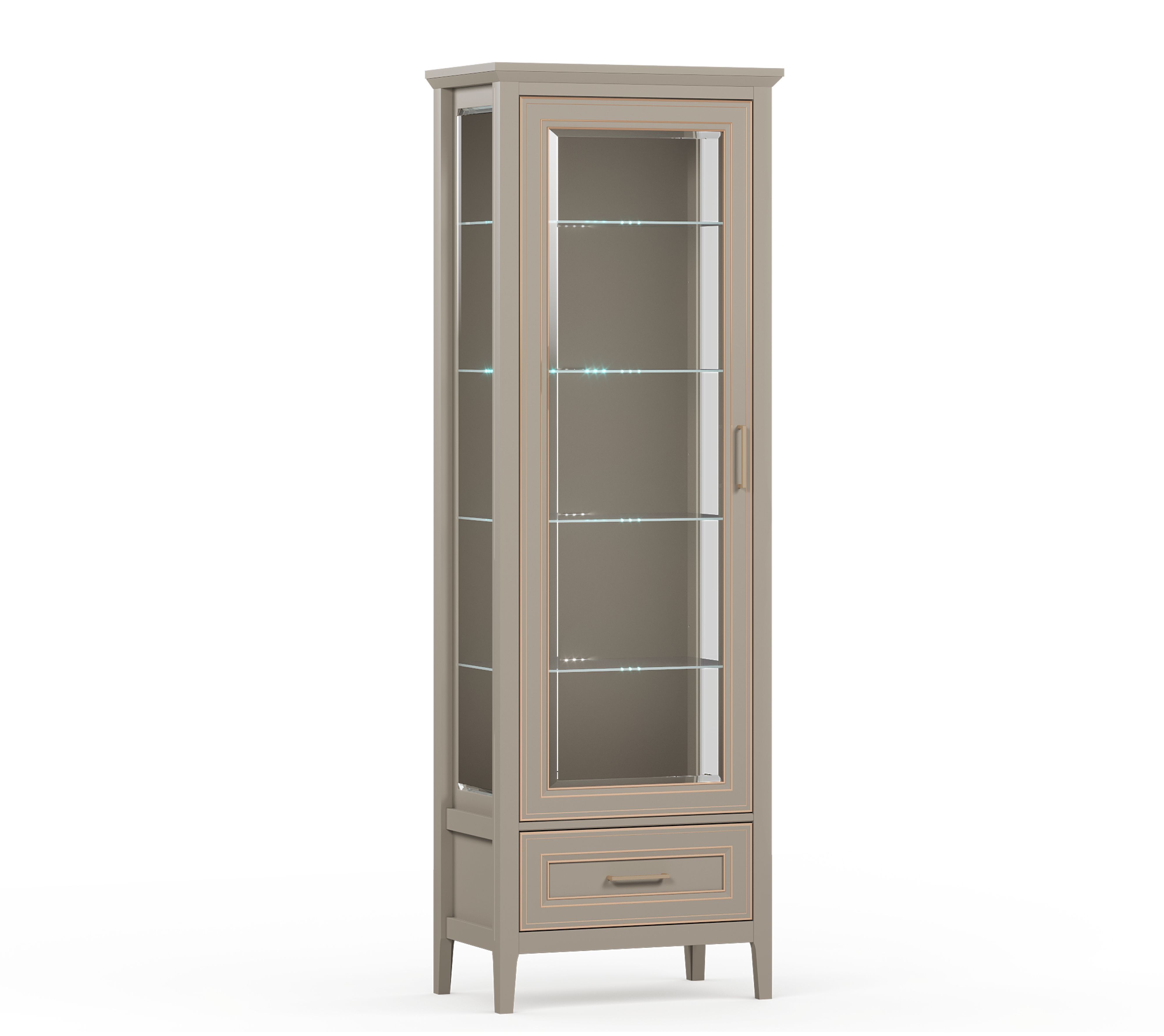 Витрина с подсветкой Classic представлена в виде однодверного шкафа на высоких ножках и с корпусом из ЛДСП. Внизу установлен выдвижной ящик для хранения мелочевок. В зависимости от специфики интерьера, дверь можно перевешивать на любую сторону.