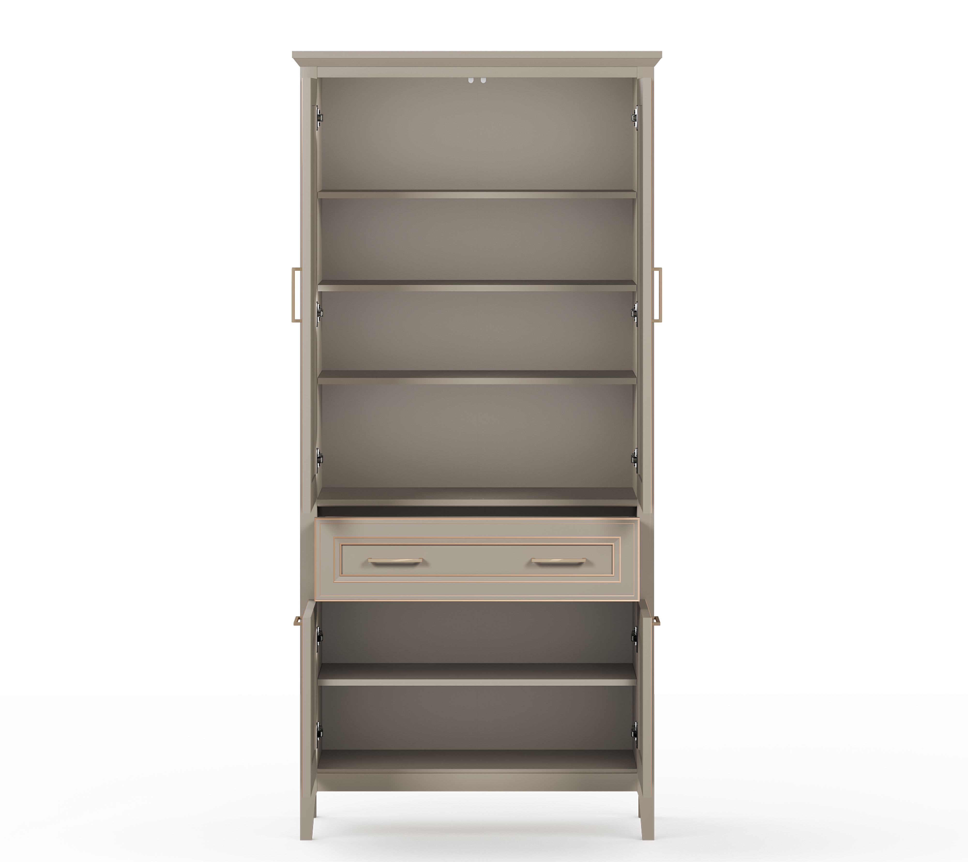 Распашной шкаф Classic REG4D1S представляет собой прямую и элегантную модель размером 95×40 см. Она условно поделена на две секции. В верхней и нижней части установлены распашные двери, в середине располагается широкий ящик на шариковых направляющих. Визуальную легкость и законченность шкафу придают высокие ножки и карниз. По-настоящему торжественный классический вид придает ему патина и позолота, тонкой линией проходящая по периметру фасадов.