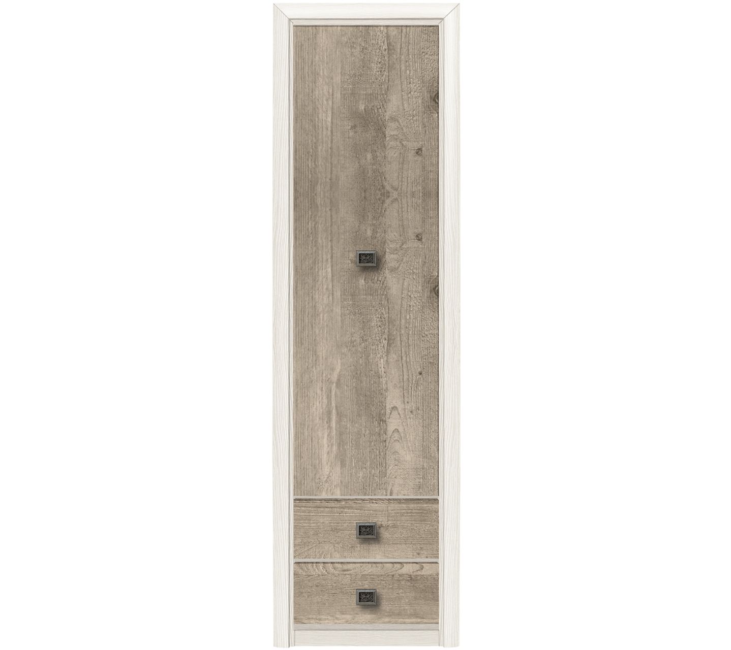 Однодверный шкаф Koen – отличное решение для маленьких комнат и помещений с нестандартными планировками. Компактный снаружи и вместительный внутри, он предоставляет достаточно места для хранения вещей разного вида и объема. Эта модель с первого взгляда он покоряет необычным сочетанием светлого каркаса в тон снежного ясеня и темных фасадов с орехово-коричневым оттенком сосны. Яркой доминантой в дизайне являются квадратные металлические ручки, придающие изделию утонченный и дорогой вид.