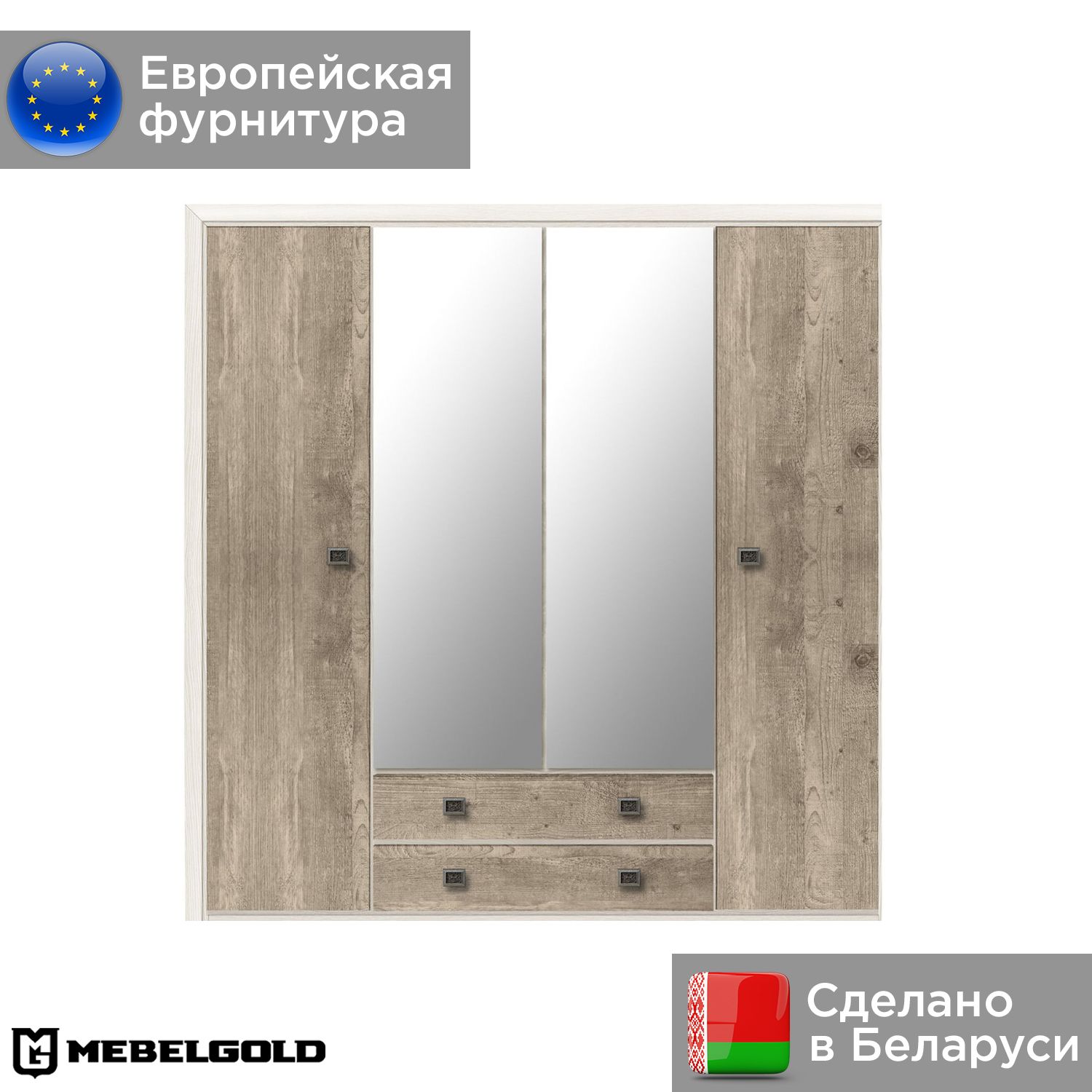 Четырехдверный шкаф Koen SZF4D2S укомплектован двумя зеркалами и ящиками. Эта конструкция два в одном сделана из ЛДСП и украшена декоративной МДФ рамкой. Наклеенная на поверхность ламинированная пленка защищает мебель от размокания и в точности передает фактуру снежного ясеня и легкий коричневый оттенок натуральной сосны.