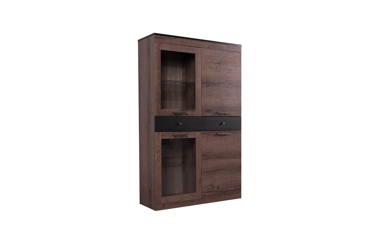 В центре шкафа с витриной Jagger установлен черный выдвижной ящик с круглыми металлическими ручками, что придает ему выразительность и стильный вид. Такую мебель можно с уверенностью устанавливать в комнатах, оформленных в стиле модерн, минимализм и хай-тек. Дверцы легко перевешиваются на левую или правую сторону, а при необходимости – дополняются LED подсветкой. Шкаф с витриной «Джаггер» является вместительной моделью с шириной 100 см, высотой 159 см и глубиной 35 см.