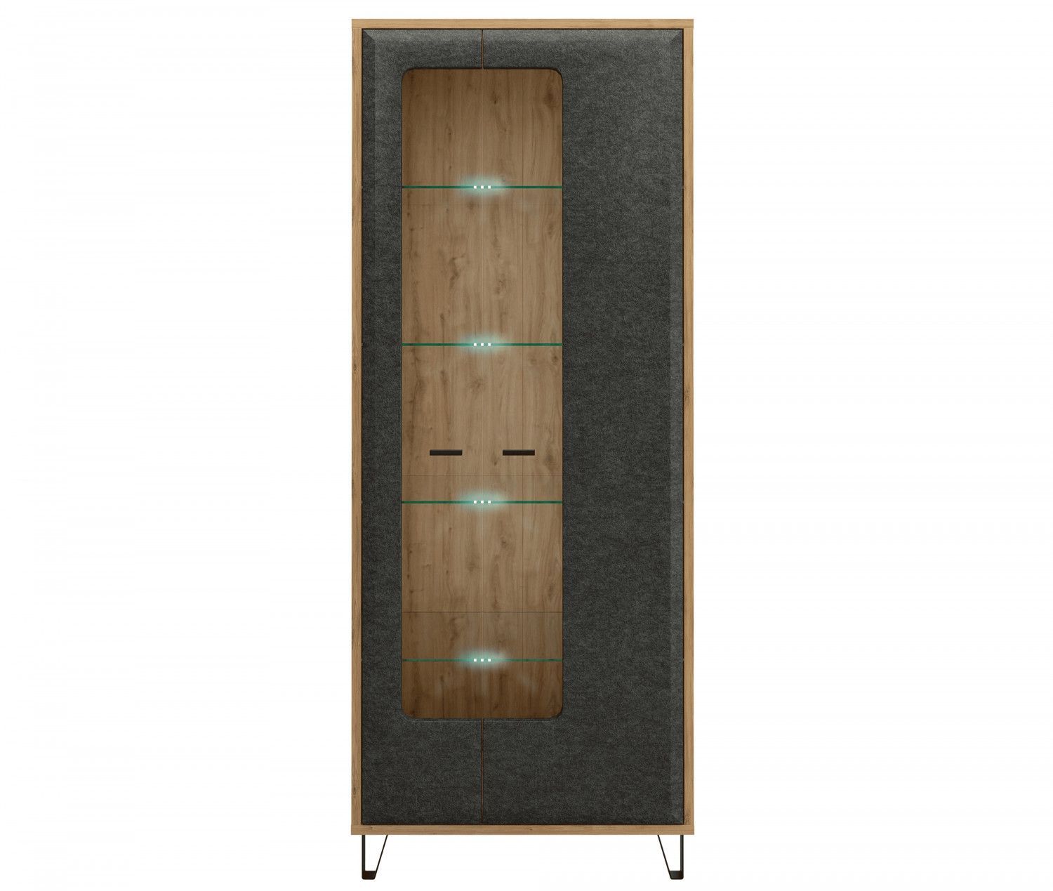 Среди каталогов с однотипной мебелью витрина с подсветкой Grace выделяется экстраординарным дизайном. Она всегда будет центром внимания, и привлекать неординарным исполнением. Две распашные дверцы разного размера и фактурная графитовая поверхность, имитирующая бетон, смотрится, как яркий акцент на фоне древесной текстуры дуба наварро.