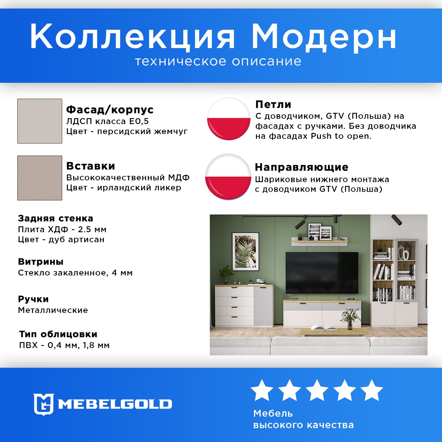Отсутствие привычного декора и сочетание ирландского ликера с персидским жемчугом является визитной карточкой шкафа с витриной Modern 1V1D/52. Такая отделка придает мебели изящество и шик и делает ключевым элементом интерьера. Шкаф-витрина прекрасно сочетается с любой другой мебелью белорусской коллекции «Модерн».
