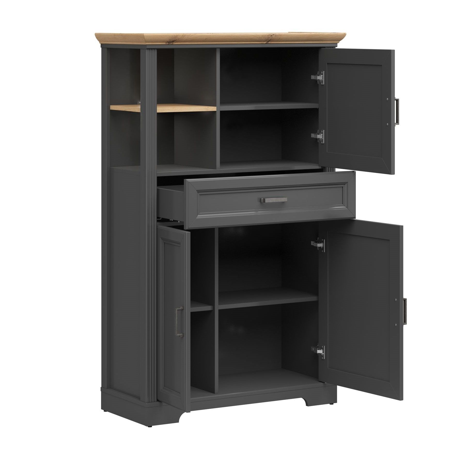 Шкаф Jasmin REG3D1S из ЛДСП класса Е1 и МДФ гарантирует безопасное пользование, а установленные петли с доводчиками – комфортную эксплуатацию. Эта модель продумана строго до мелочей. Его открытые полки идеально предназначены для хранения посуды и коллекционных вещей. За глухими дверями можно разложить домашнюю атрибутику – все то, что не должно пылиться и попадать под действие солнца.