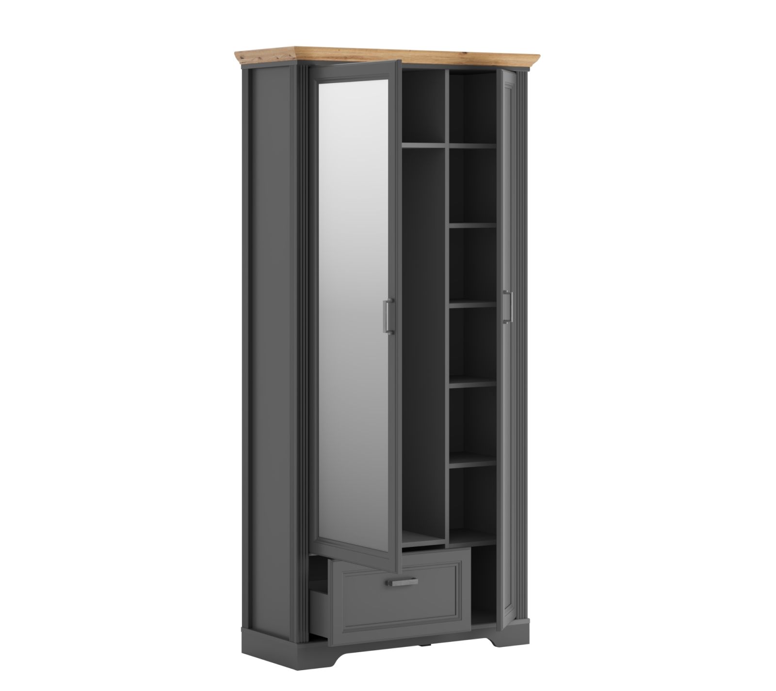 Небольшой двухстворчатый шкаф Jasmin BRW поможет обставить комнату и хранить вещи, избегая пыли и солнечного воздействия. Его конструкция универсальна и подходит для спальни, гостиной, прихожей и любой другой комнаты. Шкаф вмещает бельевое и платяное отделение. Внизу установлен дополнительный ящик для хранения мелких вещей – чулочно-носочного трикотажа, перчаток и ремней. В одной из дверей располагается зеркало.