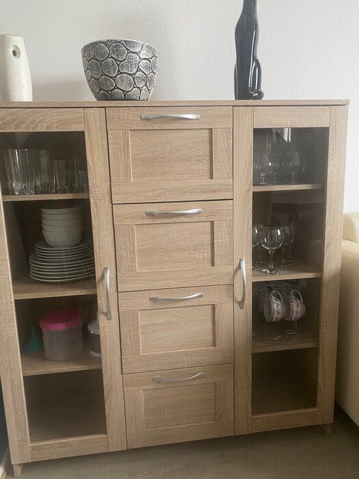 Тумба СИРИУС с двумя стеклянными дверьми и четырьмя ящиками, 1171х412х1234, цвет Дуб Сонома. Изготовлена из кашированного ДСП толщиной 16 мм. Крепится к стене. Гарантийный срок для жилых помещений 24 месяца, для общественных помещений - 18 месяцев.