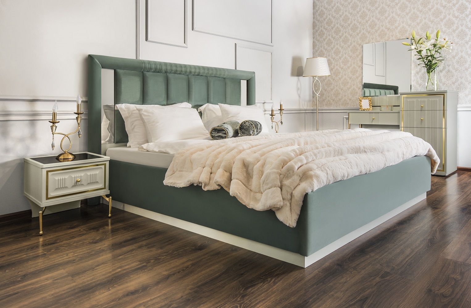 Изголовье: Спинка в велюре, по бокам зеркальные вставки с фацетом, с тыльной стороны кровати (сзади) материал ЛДСП;