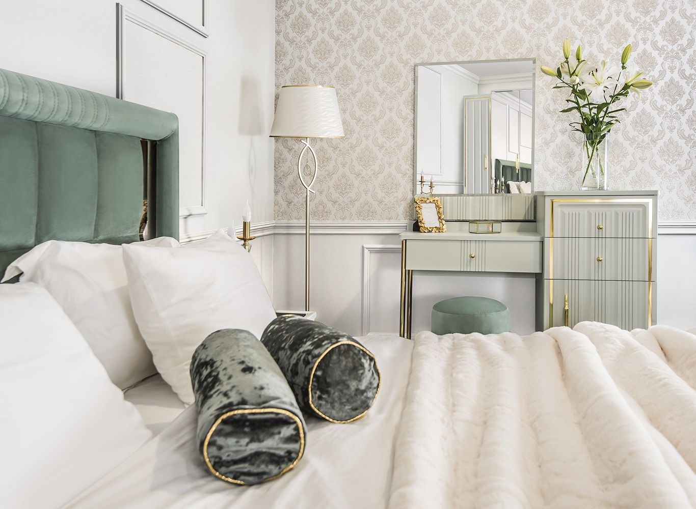 К спальне Замира предлагается мягкий велюровой пуф на латунном цоколе, мягкая мебель — диван и кресло коллекции Lara или Мокко идеально дополнят композицию