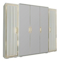 Внутреннее наполнение шкафа выполнено по стандартам гардеробной и укомплектован полки для белья и штанга для одежды. Фасады оснащены фурнитурой с доводчиком и украшены металлизированным латунным декором — этот тренд сезона является авторским стилем фабрики Эра и такой же декор используется в спальне Lara – это расширяет возможности и позволяет миксовать коллекции новинок. Шкафы выпускаются 4х (1+2портал+1) и 5ти (1+3портал+1) створчатые самые функциональные варианты.