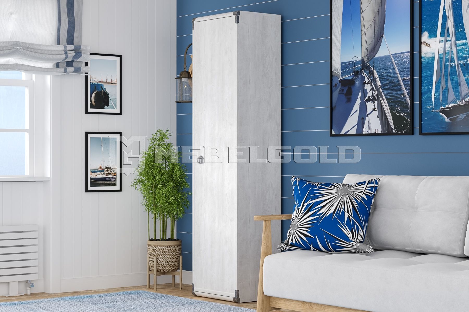 Высокий одностворчатый шкаф Indiana представлен в цвете сосна каньон. Его фасады светлого цвета дополнены металлическими накладками на углах и латунными ручками по типу подковы. Модель в такой отделке является приоритетным вариантом для классических интерьеров и комнат, оформленных в стиле кантри. Ее можно установить в детской, гостиной или домашней библиотеке. Мини-шкаф легко впишется в узкое пространство и эффективно решит поставленные задачи.