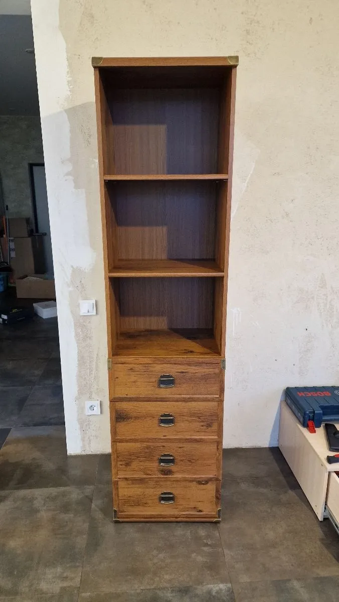 Высокий стеллаж Indiana в цвете дуб саттер вписывается в любой интерьер и по вместительности не уступает обычному шкафу. Его высота составляет 195 см, а ширина – 50 см. Пенал поделен на 2 отделения: вверху располагаются открытые полки из ЛДСП, а внизу находятся 4 выдвижных ящика.