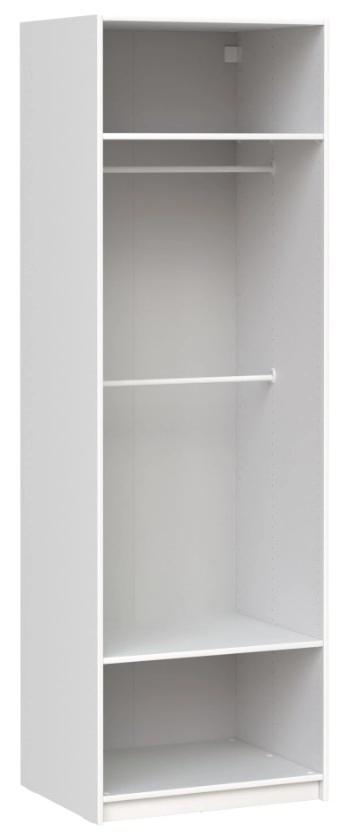 Стеллаж МАКС 75х58х233, цвет Белый Имеется возможность установки полок на желаемом уровне, имеется возможность установки штанги на желаемом уровне Толщины деталей: ДСП 18 мм Фурнитура: две штанги овальные металлические, полкодержатель пластмассовый с фиксатором