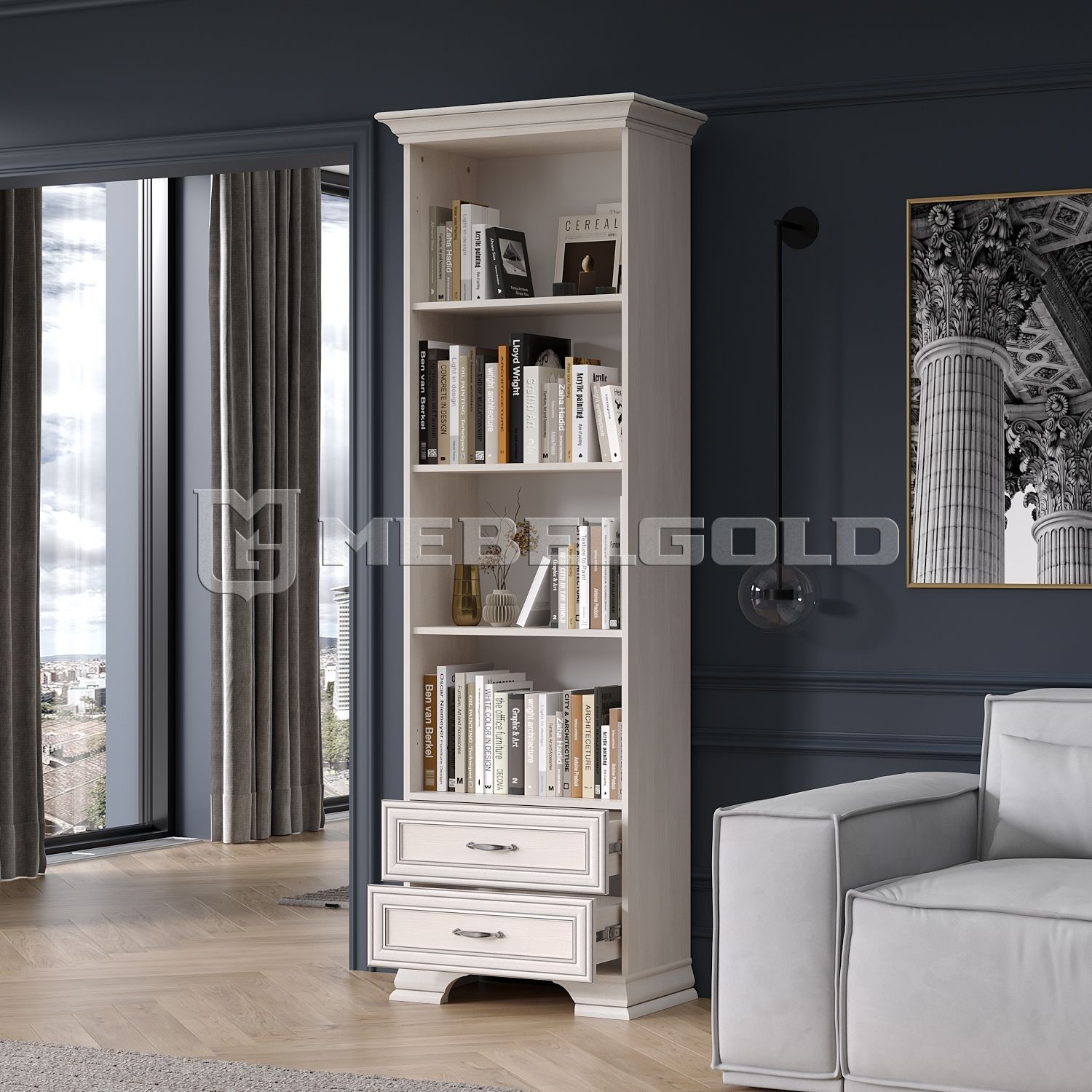 Любители классической мебели по достоинству оценят открытый белорусский шкаф Tiffany коллекции 2S. Этот узкий пенал высотой 212 см и шириной 69 см займет маленькое пространство и уютно разместит на своих полках книги и предметы декора. В его верхней части находится три отделения, а внизу установлено два выдвижных ящика.