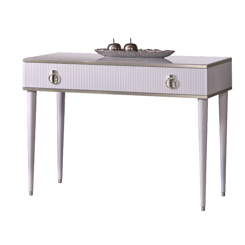 Туалетный стол Rimini Solo – образец итальянского дизайна и европейского комфорта. По внешнему виду он напоминает консоль с изящными конусообразными ножками, дополненными латунными наконечниками. Идеальная симметрия, сдержанная цветовая гамма, акцентные вставки под золото или серебро – не единственные особенности столика «Римини Соло». В тон этим элементам здесь подобраны итальянские руки, а в ящике установлены направляющие с доводчиками.