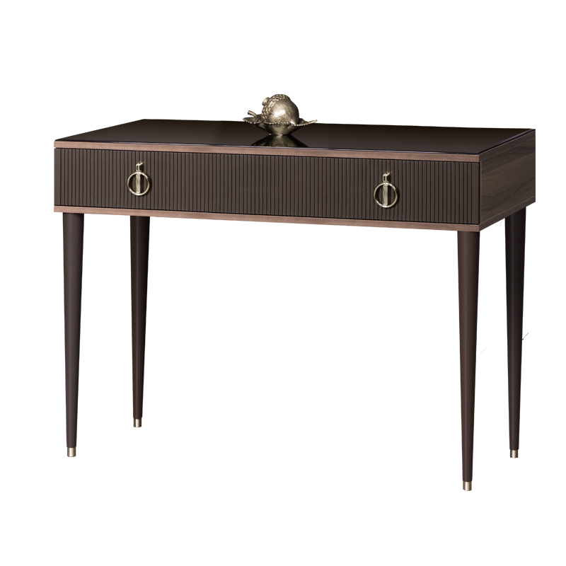 Туалетный стол Rimini Solo – образец итальянского дизайна и европейского комфорта. По внешнему виду он напоминает консоль с изящными конусообразными ножками, дополненными латунными наконечниками. Идеальная симметрия, сдержанная цветовая гамма, акцентные вставки под золото или серебро – не единственные особенности столика «Римини Соло». В тон этим элементам здесь подобраны итальянские руки, а в ящике установлены направляющие с доводчиками.