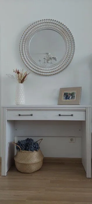Туалетный стол Stylius – это модель с широким выдвижным ящиком и двумя устойчивыми опорами. Его корпус изготовлен из ЛДСП класса эмиссии Е1, а при отделке ножек и фасада использован МДФ. Изящную конструкцию дополняют металлические квадратные ручки и патина, придающая фасаду винтажный вид.