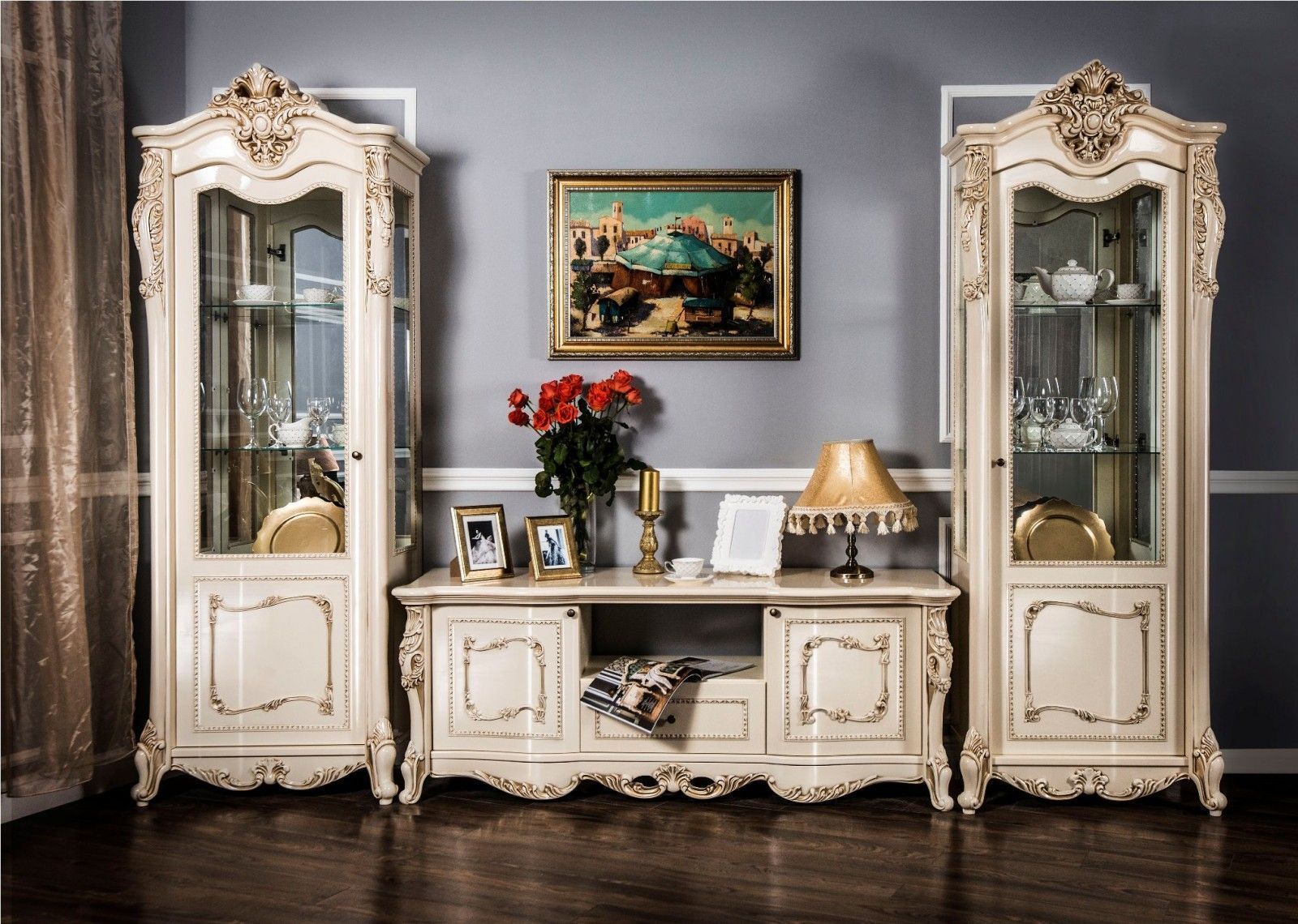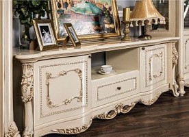 От классического стиля ТВ тумба «Джоконда» взяла округлые и изогнутые силуэты. Ее дверцы украшены миниатюрными металлическими ручками под бронзу. Модель отличается необыкновенным изяществом и может быть использована в гостиных отдельно или вместе с другой мебелью «Джоконда».