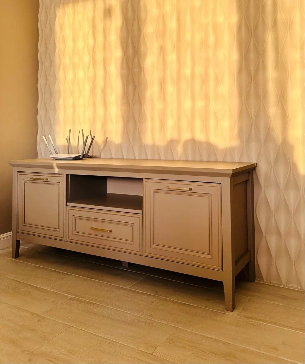 Напольная тумба BRW Classic шириной 158 см и глубиной 40 см подойдет для телевизора диагональю 60-65 дюймов. В ее задней стенке проделаны отверстия для проводов. Индивидуальные особенности тумбы под ТВ «Классик»: