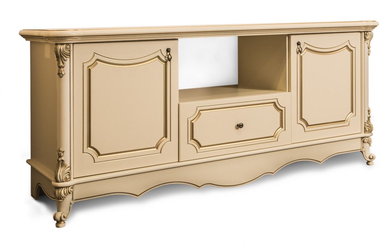 ТВ тумба «Мона Лиза» крем – это классическая мебель, которая существует независимо от устоев времени и моды. Она является надежной подставкой для телевизора, а также средством выражения стиля. Это вместительная конструкция размером 170х52 см (ш/г) с распашными дверцами, выдвижным ящиком и открытой нишей для аудиотехники.