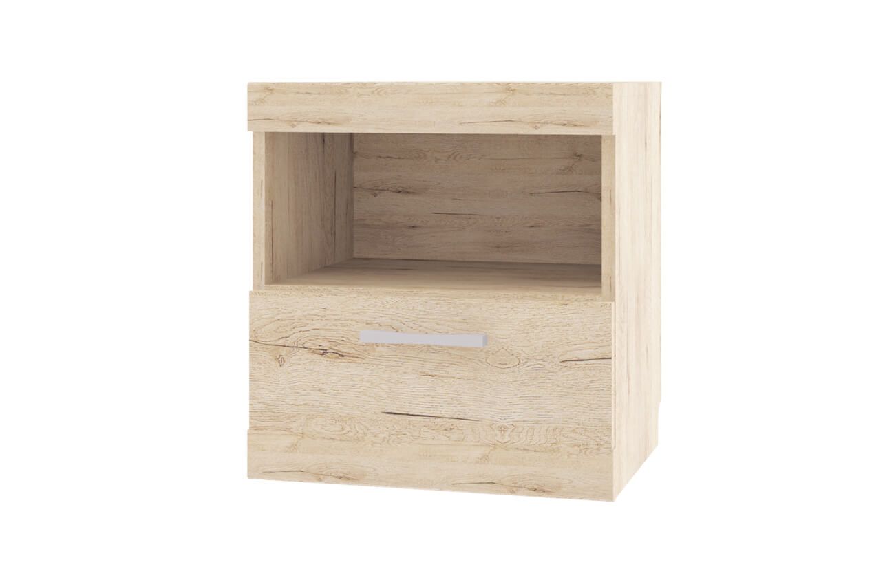 Прикроватная тумба 1S Oskar – это стандартная модель с открытым отделением и выдвижным ящиком. Ее размер составляет 45×35 см, где первый параметр обозначает ширину, второй – глубину. Эта модель тумбочки изготовлена на белорусском заводе Anrex с использованием экологически безопасного материала – ламинированной ДСП категории Е1. Корпус и фасады тумбочки выполнены в древесных оттенках и имитируют фактуру дуба санремо.