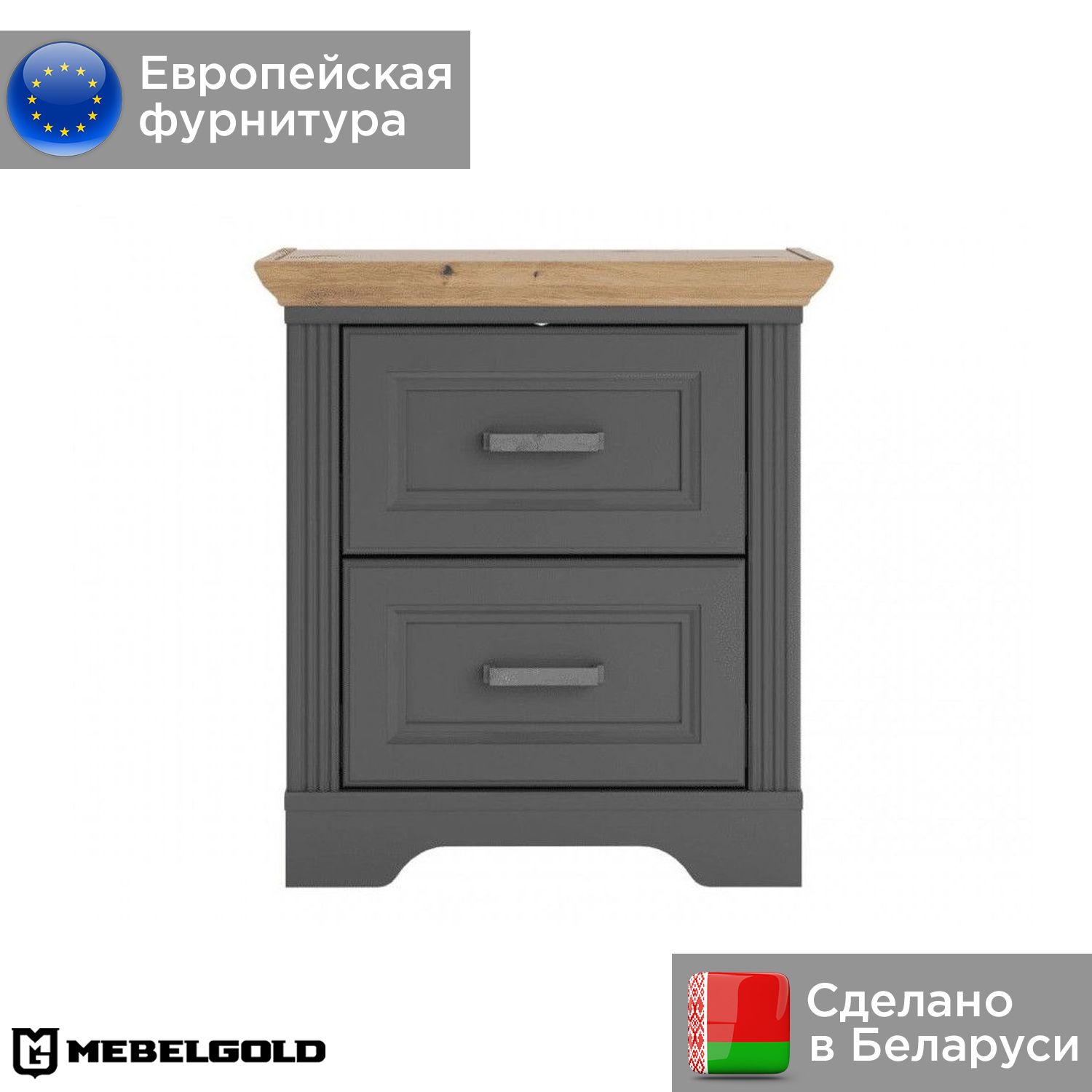Прикроватная тумба с двумя выдвижными ящиками Jasmin – это компактная конструкция размером 53×41×59 см. Модель имеет обтекаемые углы с продольными вставками из МДФ и широкие ножки для устойчивого положения. Преобладающим цветом тумбочки является насыщенный графит, который придает обстановке выразительность. Ее темный оттенок дополняет светлая столешница под дуб артизан. Вместе они составляют гармоничную композицию.