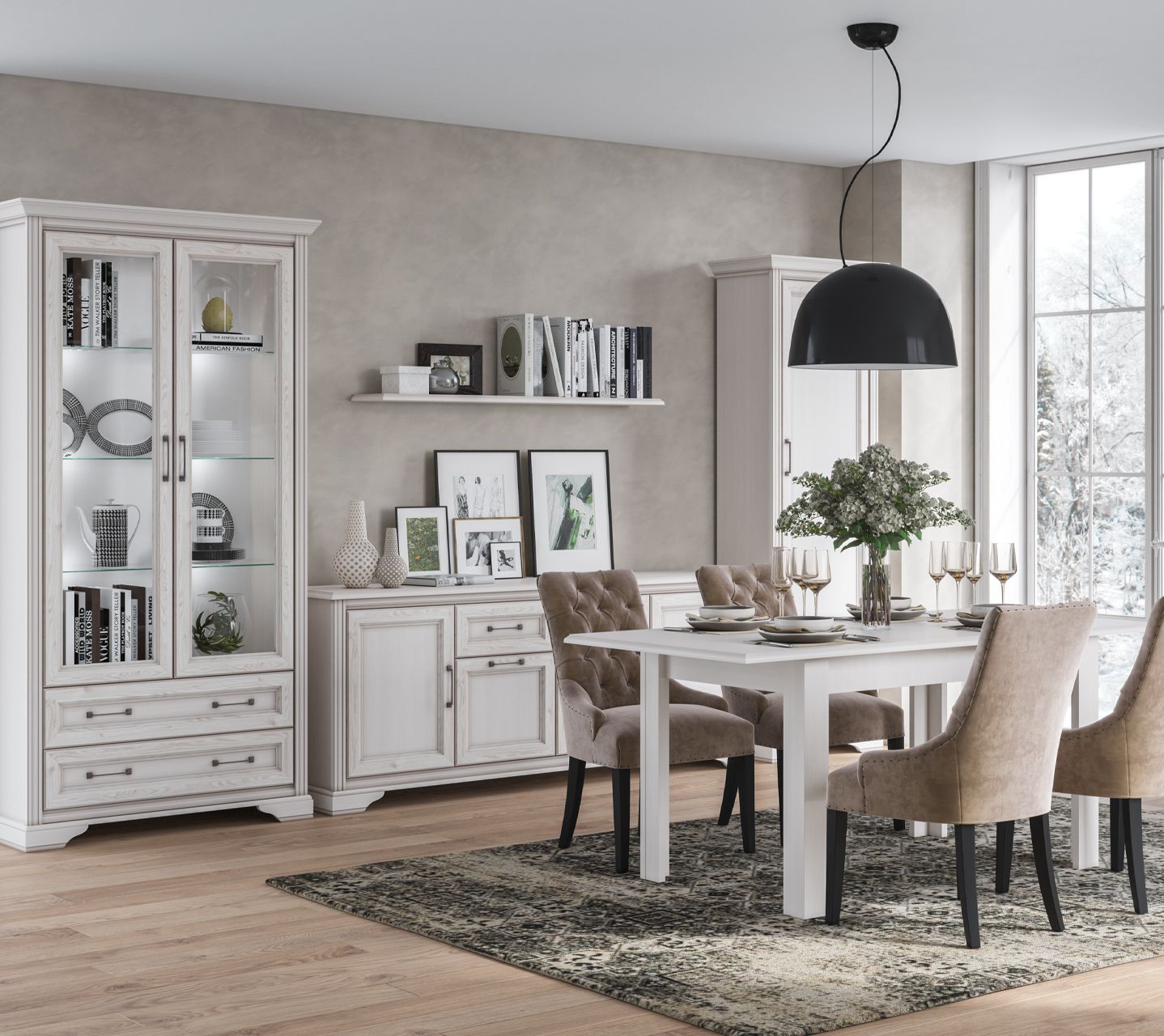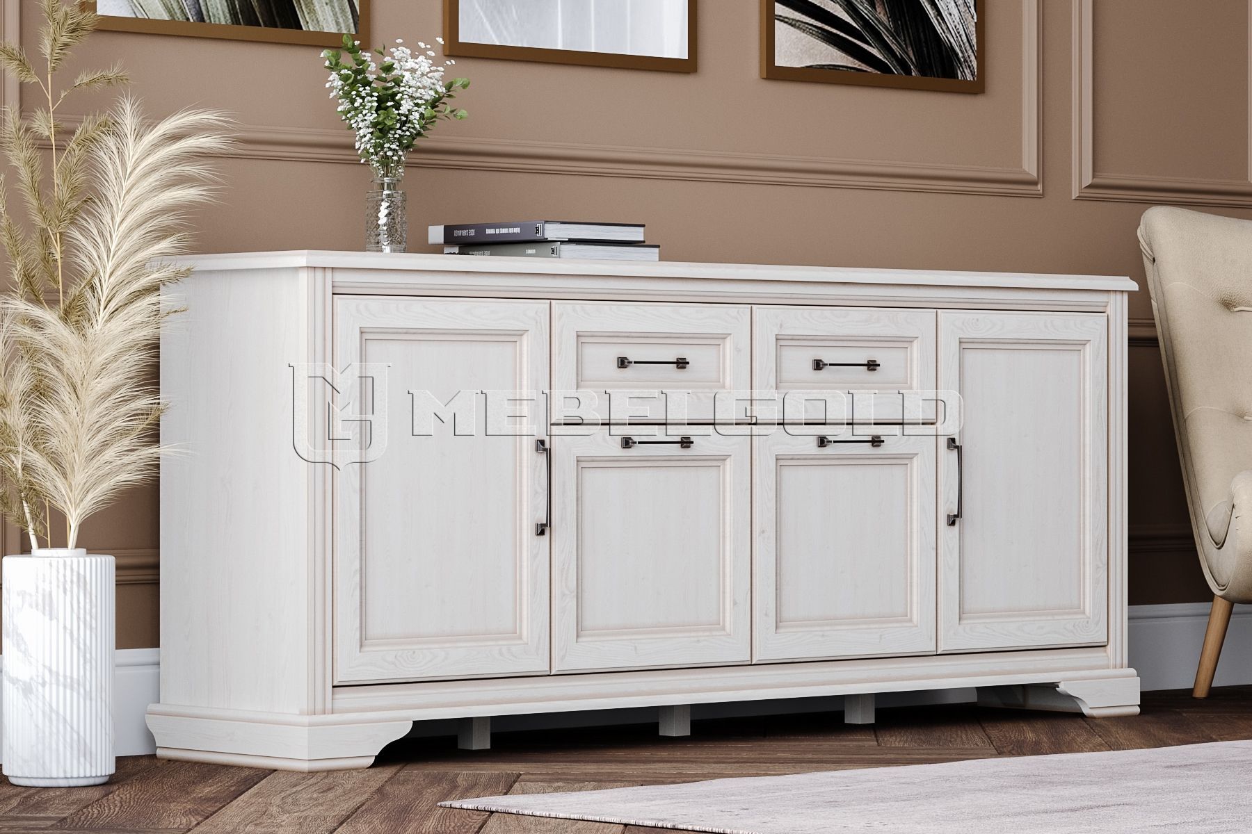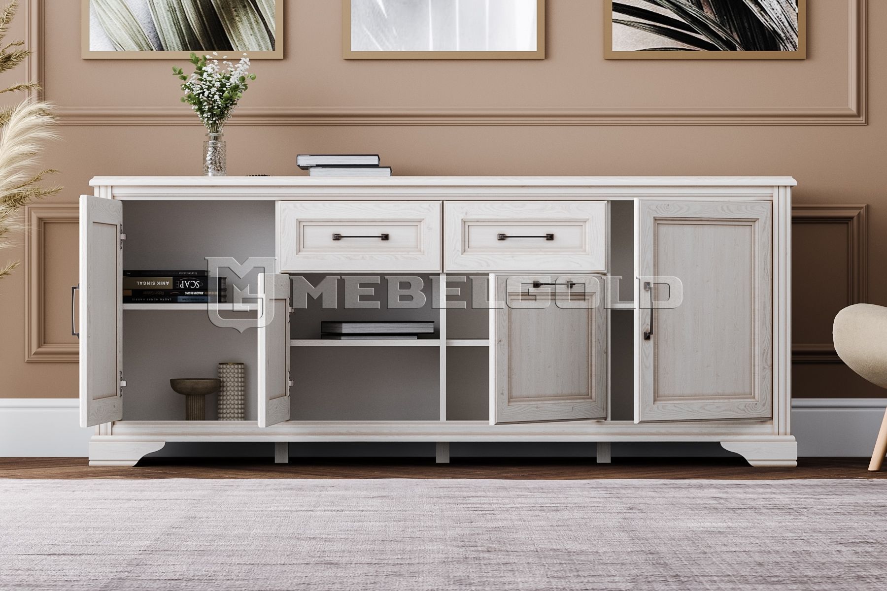 Модель укомплектована двумя выдвижными ящиками и четырьмя глухими дверцами. Это прекрасный вариант для узких гостиных и длинных детских комнат. Гармоничнее всего она смотрится у стены в комплекте с мебелью в аналогичном дизайне.