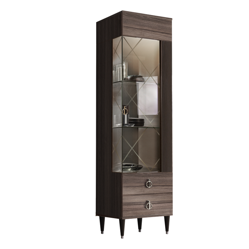 Визуально легкая и компактная витрина Rimini Solo занимает в высоту 2 м. Ее ширина составляет 60 см, а глубина – 45 см. Оптимально для размещения в ограниченном пространстве. Премиальный внешний вид шкафу-витрине придают конусообразные ножки с отделкой латунью. Проходящая по правой стороне декоративная фрезерованная я вставка и ручки-кольца под золото или серебро делают конструкцию особенно запоминающейся.