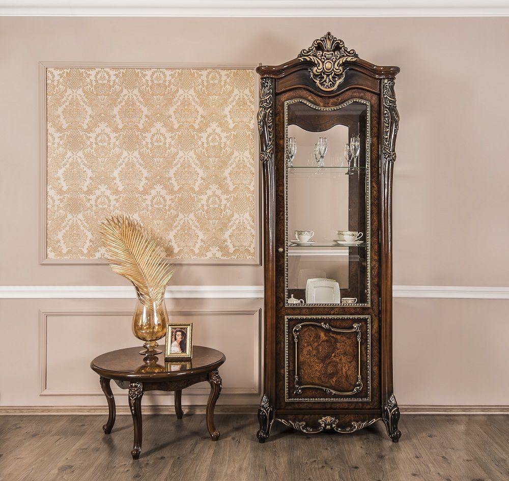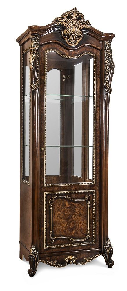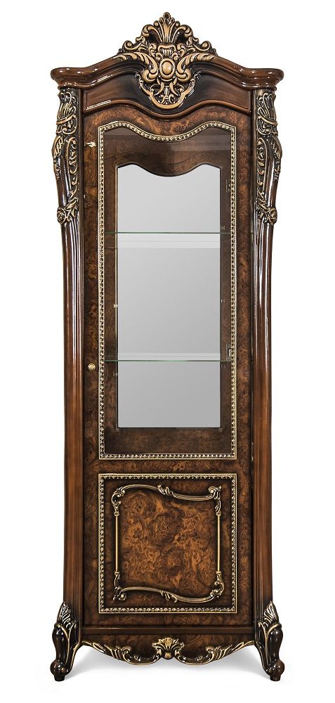 Однодверная витрина «Джоконда» в цвете корень дуба глянец по праву считается мебелью для королевских особ. Именно такими посудными шкафами с росписью пользовались еще в средние века. Эта мебель считалась признаком состоятельности и хорошего вкуса. Шкаф-витрина «Джоконда» с покрытыми эмалью фасадами и золочеными орнаментами создаст в доме роскошную обстановку и станет уютным местом для хранения посуды. Подчеркнутую вальяжность ей придают изогнутые линии и фигурные ножки с растительными орнаментами.