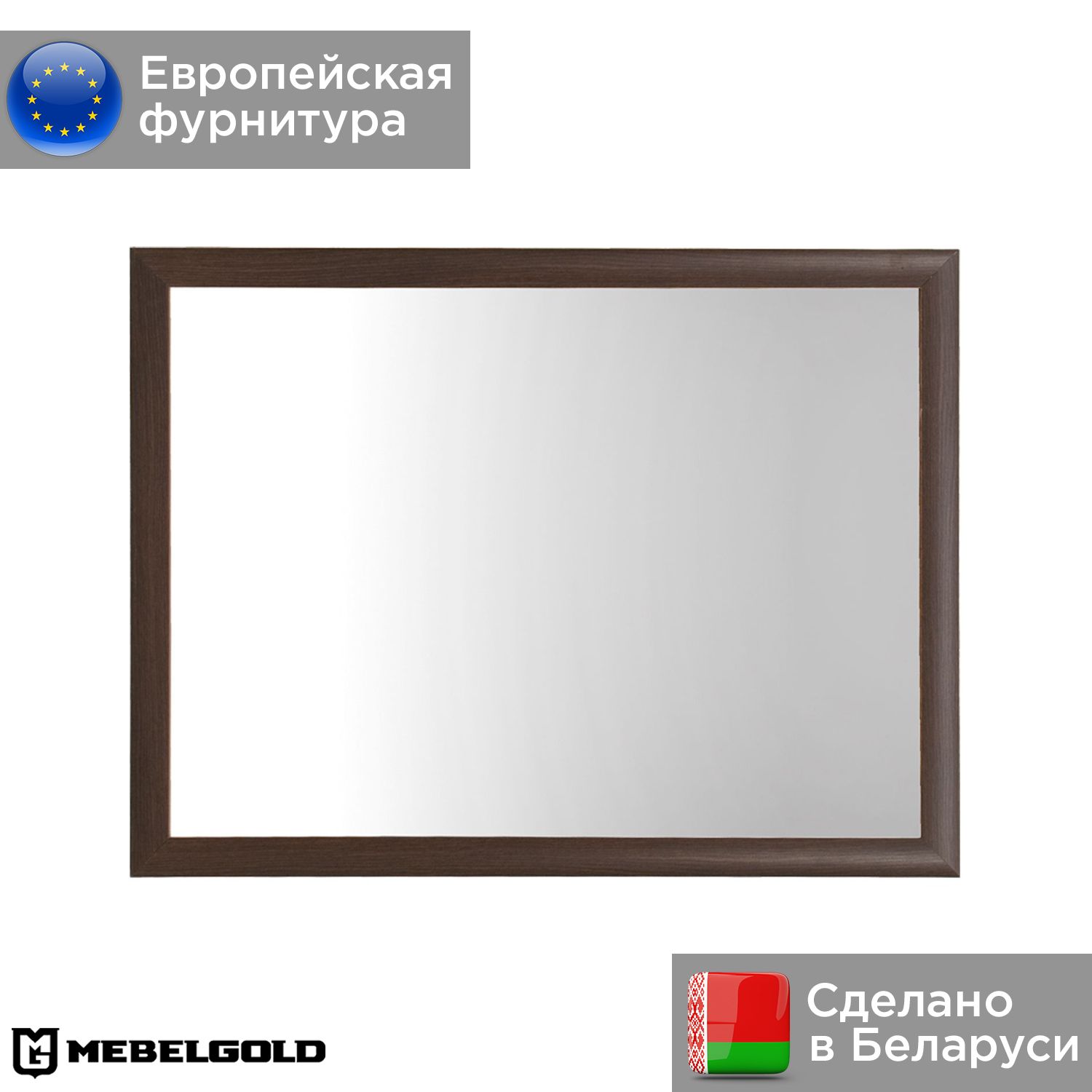 В дизайне современного зеркала Koen превалируют прямые линии и выразительная древесная текстура. Оно оформлено в элегантную раму из ЛДСП/МДФ с насыщенным оттенком венге штрокс и подчеркнутыми темными прожилками. Темный багет придает полотну благородный вид и особенно отчетливо выделяется на фоне светлой стены.